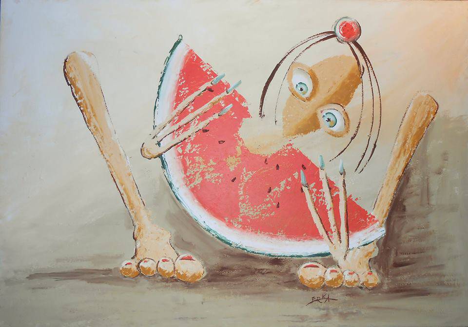 Na obrazie widoczne jest nietypowe ujęcie postaci w interakcji z soczystym kawałkiem arbuza, trzymanym z entuzjazmem. Kolory są łagodne, dominuje pastelowy róż i kremowy beż, które kontrastują z intensywniejszą czerwienią owocu. Kompozycja sprawia wrażenie dynamicznej, a postać, z dużymi, wyrazistymi oczami, wydaje się zaskoczona lub zachwycona swoim smakołykiem. Artysta posłużył się techniką impresjonistyczną, z widocznymi pociągnięciami pędzla, które dodają obrazu energii. Obraz jest nieco surrealistyczny, co skłania do zatrzymania się na chwilę i zastanowienia się. Może wywołać uśmiech i uczucie beztroski, przywodząc na myśl letnie, dziecięce wspomnienia. Atmosfera dzieła jest playful i radosna. Mamy tu coś jakby chaotyczny, ale uroczy świat z dziecięcego snu: "Wow, taki wielki arbuz!". Takie podejście do sztuki, które łączy w sobie humor z elementami codzienności, sprawia, że obraz jest nie tylko ciekawy, ale i zabawny.