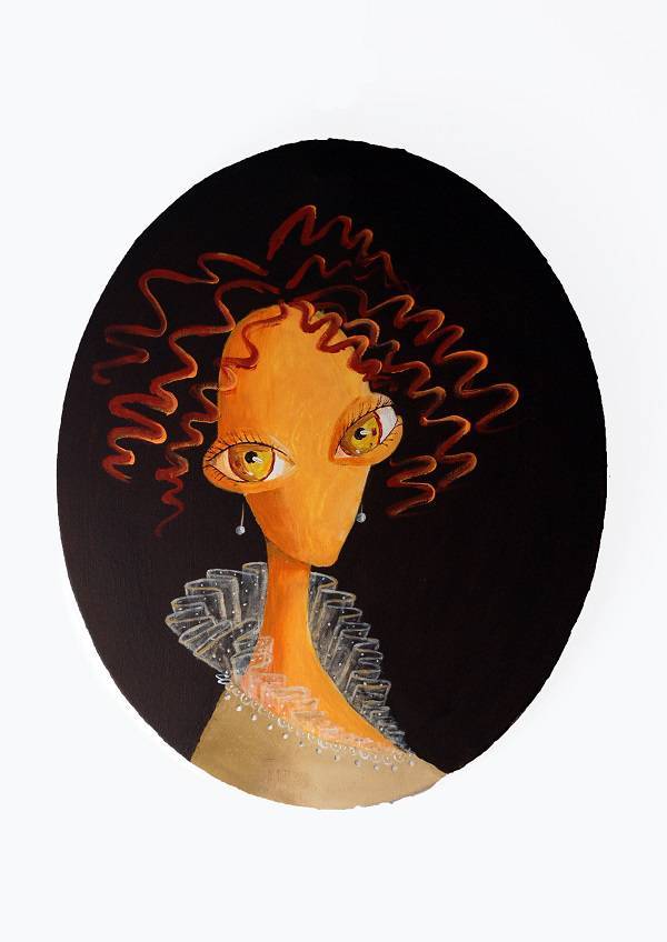 Obraz emanuje niezwykłym magnetyzmem. Centralna postać spogląda z niego wielkimi, hipnotyzującymi oczami, które wydają się wręcz pochłaniać spojrzenie widza. Kontrast pomiędzy ciepłym pomarańczowym odcieniem skóry a ciemnym tłem nadaje mu intrygującego charakteru. Kręcone włosy rozwichrzone na boki tworzą dynamiczny, niemalże taneczny rytm. Ten wir energii sprawia, że trudno oderwać wzrok od płótna. Nie wiem dlaczego, ale te włosy wyglądają jak sprężynki! Artysta zastosował płynne, łagodne pociągnięcia pędzla, umożliwiające subtelne przejścia kolorystyczne. Nastrój dzieła balansuje na granicy tajemniczości i figlarności, zdaje się szeptać historie nieopowiedziane. Styl surrealistyczny, z nutką dream-like narracji, zachęca do refleksji. Można się zastanawiać, kim jest ta postać? Co chce nam powiedzieć? Te pytania rodzą emocje - od ciekawości po niepokój. Całość tworzy unikalne doświadczenie, spojrzenie w głąb artystycznej duszy, celebracji indywidualności i wyrazistości. Fascynujący piece of art, który pozostawia ślad.
