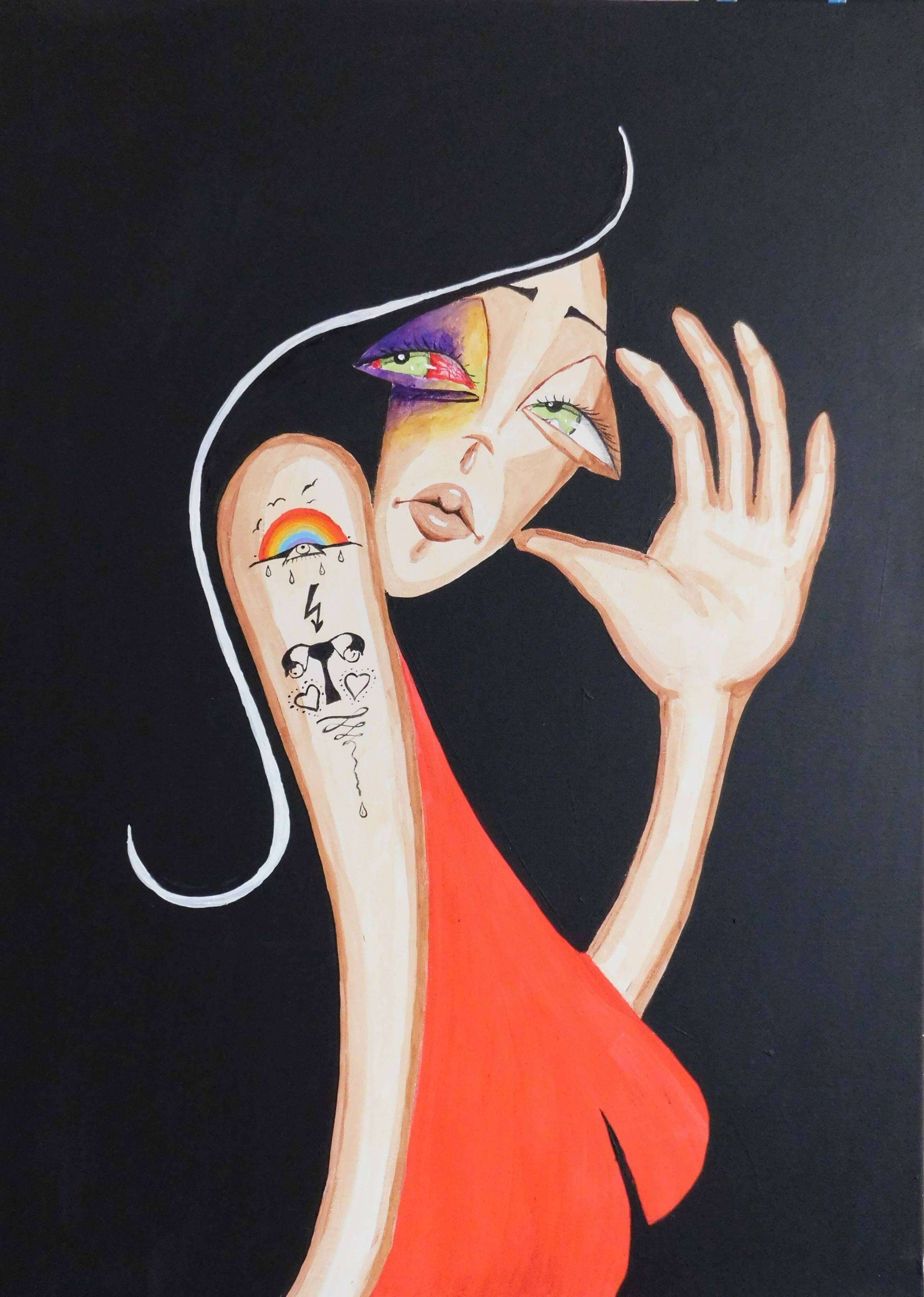 Ten obraz jest jakby dziwny. Dominuje czerń, która tworzy tło dla surrealistycznej postaci o wydłużonej sylwetce. Jej twarz jest zniekształcona, z dużymi, spiczastymi oczami eksplodującymi kolorami: fioletowymi, żółtymi i zielonymi. Asymetria formy nadaje całości dynamizmu. Gładkie linie i mocne kontury przecinają kompozycję, a kreska rysunku jest śmiała i bezkompromisowa. Jedno krótkie zdanie? No to: pani ma fajne tatuaże! Na ramieniu bohaterki widać kolorowy tatuaż przedstawiający oko, tęczę i krople deszczu. Czy to oznaki nadziei? A może nostalgii? Artystyczne zderzenie sztuki abstrakcyjnej z surrealizmem tworzy atmosferę tajemnicy. Wywołuje emocje, od niepokoju po fascynację. Malarskie "touch" przypomina mi nieco styl Picassa. Wreszcie, lekko zdeformowane dłonie, w pozie jakby przywołującej lub odpychajacej, zwiększają dramaturgię. Możesz poczuć się zarówno zafascynowany, jak i zaniepokojony. To naprawdę intrygujące dzieło.