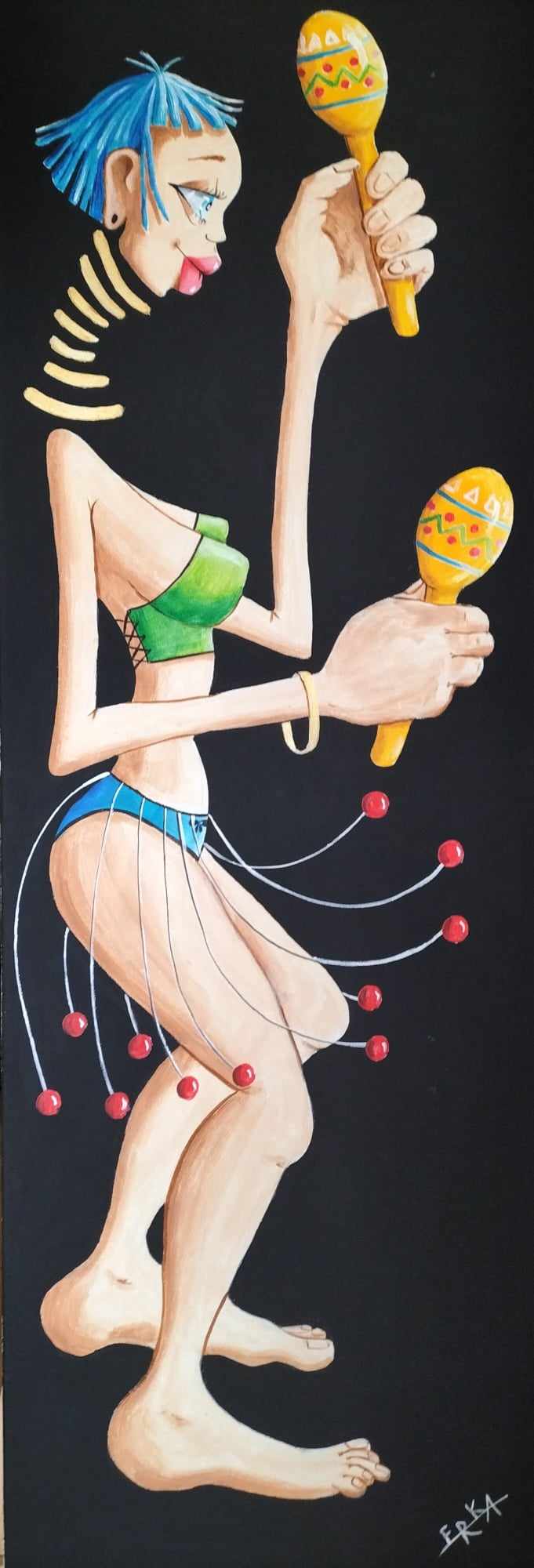 Obraz emanuje energią i żywiołowością, przedstawiając postać pełną humoru i ruchu. Kolorystyka jest wyrazista, dominują jaskrawe odcienie zieleni, błękitu i żółci, które wybijają się na ciemnym tle. Charakterystyczne dla tego dzieła są wydłużone formy, zwłaszcza ramiona i nogi postaci, co nadaje kompozycji surrealistyczny i nieco karykaturalny klimat. To jakby zetknięcie figury ludzkiej z abstrakcją. Artysta zastosował odważne kreski i płaskie kolorowe plamy, co przypomina nieco styl cartoonowy. Atmosfera obrazu jest radosna i dynamiczna; ma się wręcz wrażenie, że za chwilę usłyszymy dźwięk marakasów trzymanych przez postać. Niesamowite jest to, jak w prostocie można wyrazić tak dużo życia i szczęścia. Obraz może wywoływać u odbiorcy uśmiech i chęć tańca. Widzę to, i czuję, że każda chwila może być pełna muzyki i ruchu. Widać tu pewien playful spirit, który porusza wyobraźnię. „Ona macha tymi kulkami i jest zabawnie!” – mogłaby powiedzieć moja młodsza córka, patrząc na te wirujące, kolorowe kule na cienkich linkach. Całość sprawia, że zastanawiam się nad ulotnością chwili i radości z prostych rzeczy.