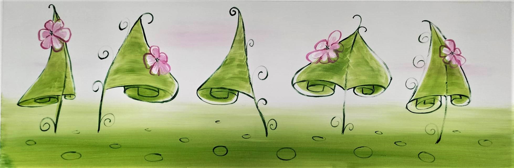 Na obrazie widzimy fantazyjne zielone kapelusze o spiralnych końcach, zdobiące je różowe kwiaty. Tło jest stonowane, pastelowe, przechodzące z delikatnej zieleni w subtelny róż. Kształty są organiczne, zaokrąglone, co nadaje pracy miękkość i delikatność. Kompozycja jest uporządkowana, z symetrycznie rozmieszczonymi elementami, tworzącymi harmonię. Atmosfera tego dzieła jest sielankowa, wręcz bajkowa, a nastrój jest pogodny i lekki. To takie miejsce, gdzie chciałoby się zatrzymać na chwilę, zapomnieć o codzienności i po prostu być. Techika artystyczna jest zbliżona do akwareli, z łagodnym rozmyciem kolorów i subtelnym cieniowaniem, które dodaje głębii. Patrząc na obraz, można poczuć spokój i szczęście; obraz wywołuje uśmiech, tak bez powodu. A dziecko mogłoby powiedzieć: "To wygląda jak domek dla małych elfów!" Artysta zastosował delikatną kreskę, tworząc lekkie, niemalże humorystyczne formy. Wprowadzenie pojedynczego słowa "whimsical" oddaje charakter tego dzieła doskonale. Niekiedy, patrząc na taką sztukę, człowiek sobie myśli, jak małe rzeczy potrafią cieszyć. To jest taki kawałek artystycznego świata, gdzie można uciec (choć na moment) od zgiełku rzeczywistości. Może to jest właśnie magia tych kształtów i kolorów, że każdy może tu znaleźć coś dla siebie.