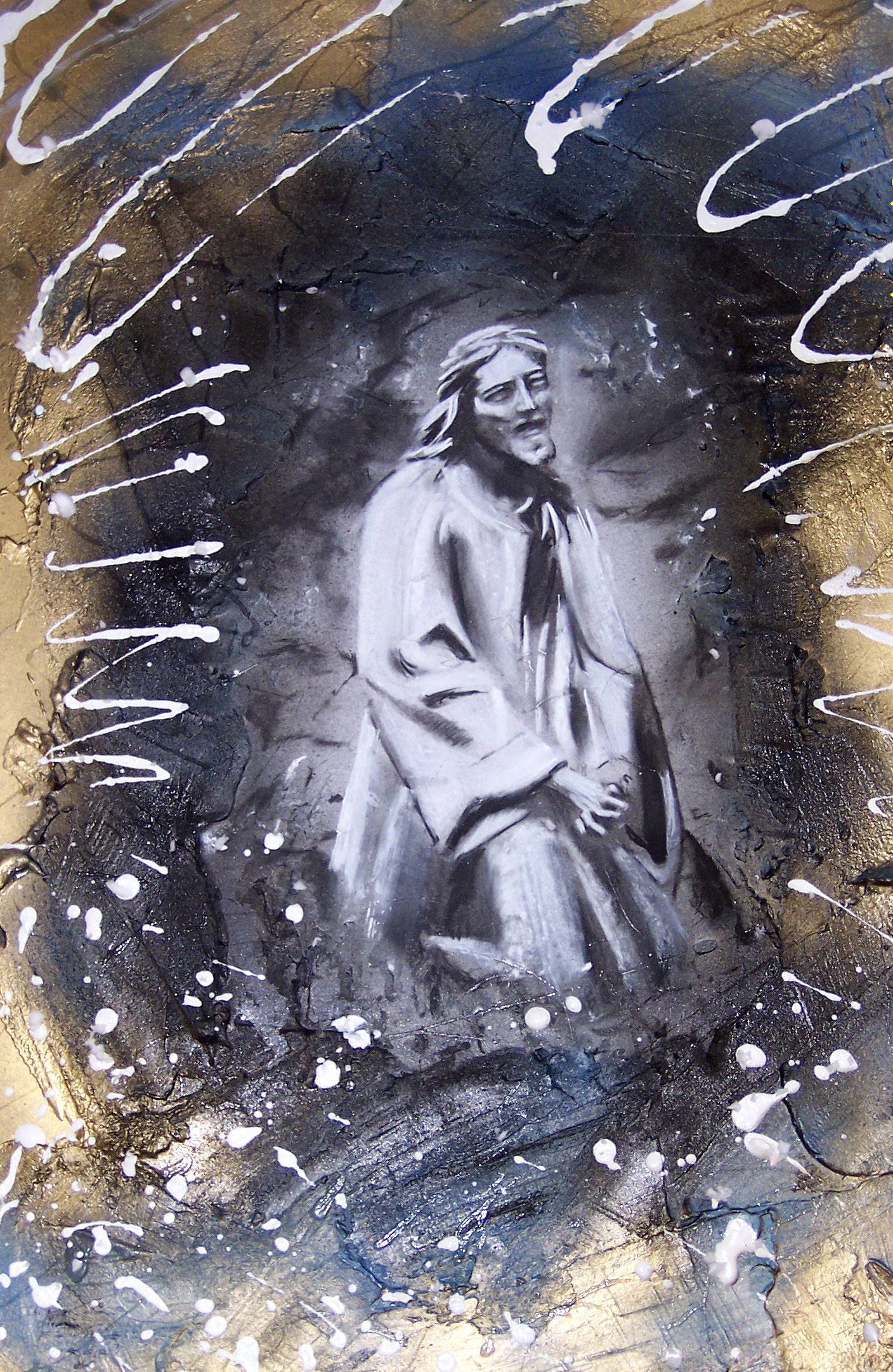 Obraz przyciąga wzrok dynamicznym zestawieniem kolorów. Dominują tu złote i chłodne szarości, które nadają dziełu pewną tajemniczość. Centrum obrazu zajmuje postać odziana w szaty, uchwycona w delikatnej tonacji czerni i bieli. Tło zdaje się być zdominowane przez artystyczne rozbryzgi bieli – jakby ktoś właśnie dodał ten "splash" energii. Całość kompozycji jest dramatyczna, niemal surrealistyczna, tworząc atmosferę zawieszoną między snem a jawą. Styl artysty można określić jako ekspresyjny, z odważnym wykorzystaniem kontrastów. Oglądając obraz, można poczuć nostalgiczny smutek, ale i niewytłumaczalny spokój. "Patrz, to prawie jak magiczny ocean" mogłoby powiedzieć dziecko, zauważając fałdy szat przypominające fale. Technika użyta przez artystę sugeruje inspirację malarstwem akcji, może nawet Pollock-esque. Pod warstwą chaosu kryje się głębokie przesłanie duchowe. Osobiście obraz budzi we mnie poczucie wiecznej refleksji nad ludzkim losem. Takie "dzieło sztuki" może prowokować do zadumy i rozmowy. Ale kto wie, może to tylko ja tak to widzę.
