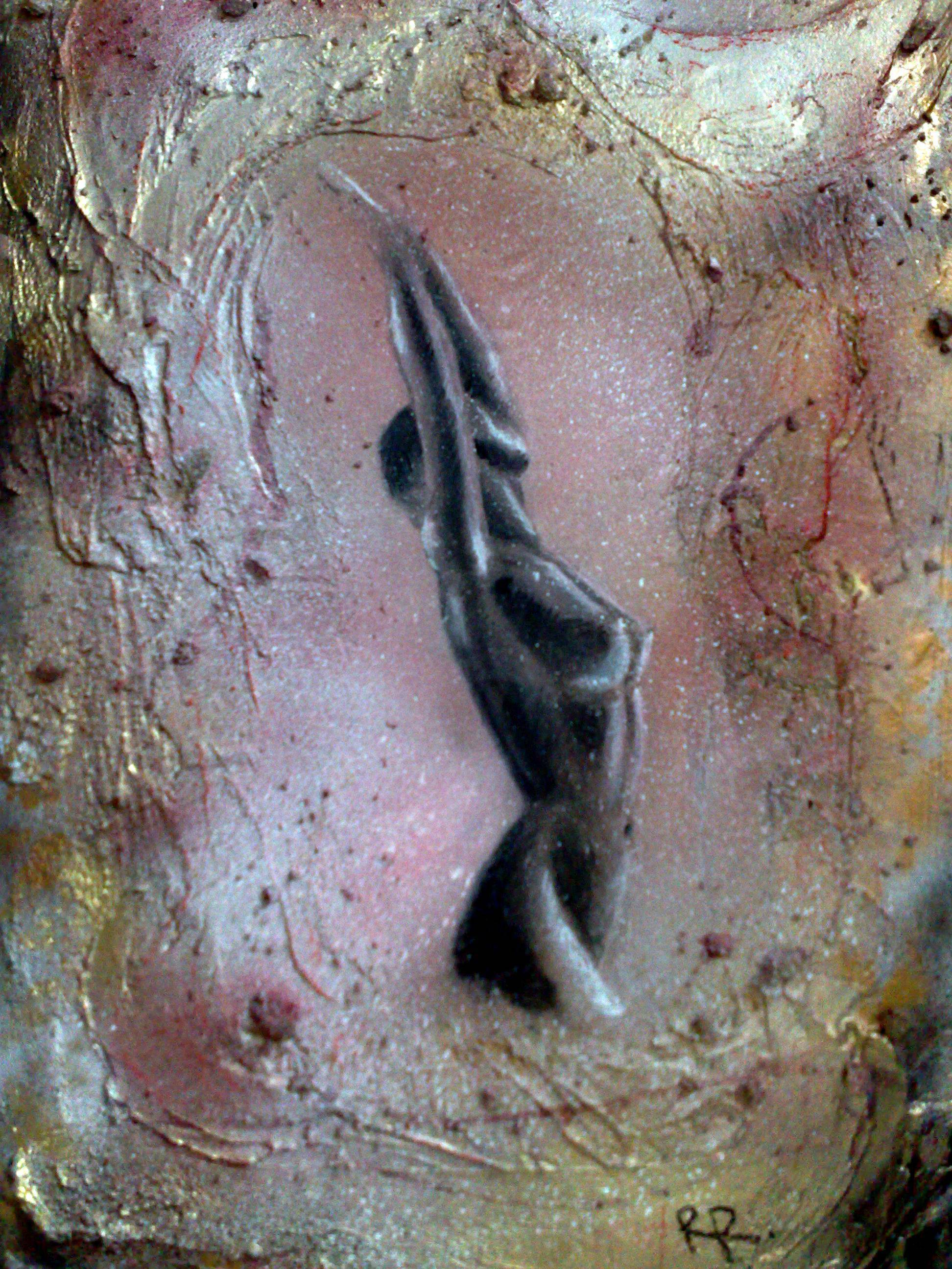 Obraz, który widzimy, to prawdziwa mieszanka kolorów i form. Dominują przygaszone odcienie brązu, różu i złota, które przeplatają się, tworząc bogatą, teksturową powierzchnię. Centralnie umieszczona sylwetka wydaje się wynurzać z tła w jakimś tańcu, jakby była zbudowana z samego światła i cieni. Jest tajemnicza. Tło przypomina abstrakcyjne fale, co dodaje obrazowi dynamiki. Artysta zastosował techniki impasto, co sprawia, że obraz jest nie tylko widoczny, ale i niemal dotykalny. Gruba warstwa farby tworzy wrażenie ruchu, a technika airbrush wygładza przejścia między kolorami, dodając delikatności. Ten obraz wywołuje we mnie uczucie spokoju, ale i pewnej tęsknoty. Wygląda to tak, jakby postać właśnie przebudziła się do nowego życia. A może to ja budzę się na nowo patrząc na nią? Who knows. Patrząc na to dzieło, można poczuć zarówno ciepło, jak i pewną melancholię. Jakby artysta chciał nam powiedzieć o przemijaniu chwili. Dla dziecka mogłoby to być opisane jako: "Zobaczyłem na ścianie bajkową wróżkę, co tańczy w chmurach". I jest to obraz, który angażuje, zmusza do refleksji, ale i pozwala na chwilę oddechu od codzienności. Czuć tu mieszankę spontaniczności i precyzji w każdym pociągnięciu pędzla.