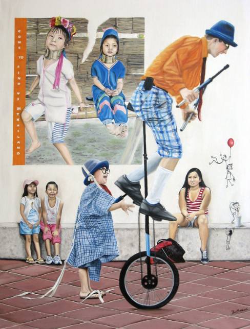 Obraz tętni życiem, pełen jest barw i radosnych postaci, które wciągają nas w swój świat. Dominują intensywne kolory – niebieski, pomarańczowy i czerwony, które tworzą dynamiczną kompozycję. Figury na unicyklach przypominają cyrkowe sztuczki, a ich stroje pełne są kontrastów, które przyciągają wzrok. Dzieci siedzące z boku patrzą z zaciekawieniem, a ci, którzy występują, zdają się być w swoim własnym świecie. Atmosfera jest pełna zabawy, niemal słychać śmiech i aplauz. Styl malarski wskazuje na połączenie realizmu z lekką nutą surrealizmu. Artysta wykorzystał techniki, które nadają postaciom niemal trójwymiarowy wygląd, a jednocześnie dodają im fantazji. Przypomina to trochę technikę "oil painting", gdzie każdy detal jest dopracowany, a jednak całość ma lekkość i dynamikę. Obraz wywołuje emocje dziecięcej radości. Można poczuć, jakbyśmy sami byli na tym występie. A balonik czerwony w górnym rogu przypomina dziecięce marzenia. Siedmiolatek mógłby powiedzieć: “Chciałbym tak jeździć na rowerku jak oni!” To dzieło to prawdziwa celebration życia, zachęca do spojrzenia na świat z odrobiną beztroski. Może wywołać uśmiech, przypomnieć o radości z małych rzeczy, o zabawie i marzeniach z dzieciństwa. Taki obraz to prawdziwa pasja, energia i moment zatrzymany w czasie.