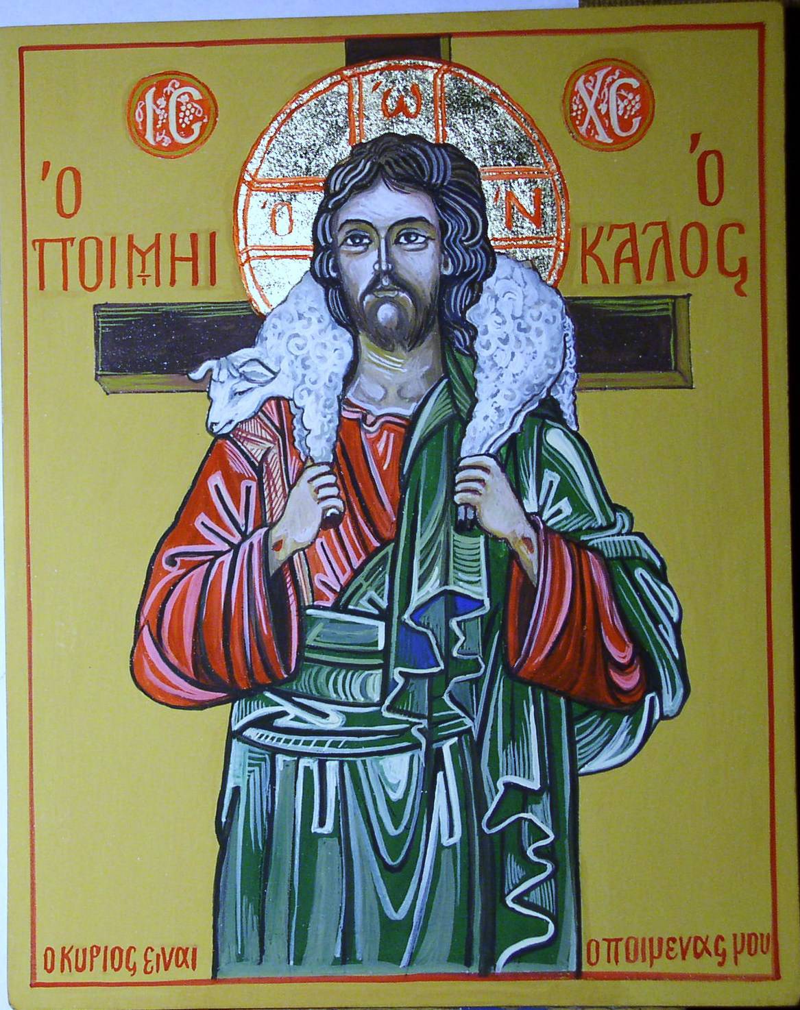 Ikona na motywach greckich przedstawia Jezusa jako dobrego pasterza-obraz namalowany na desce w technice tempery jajecznej