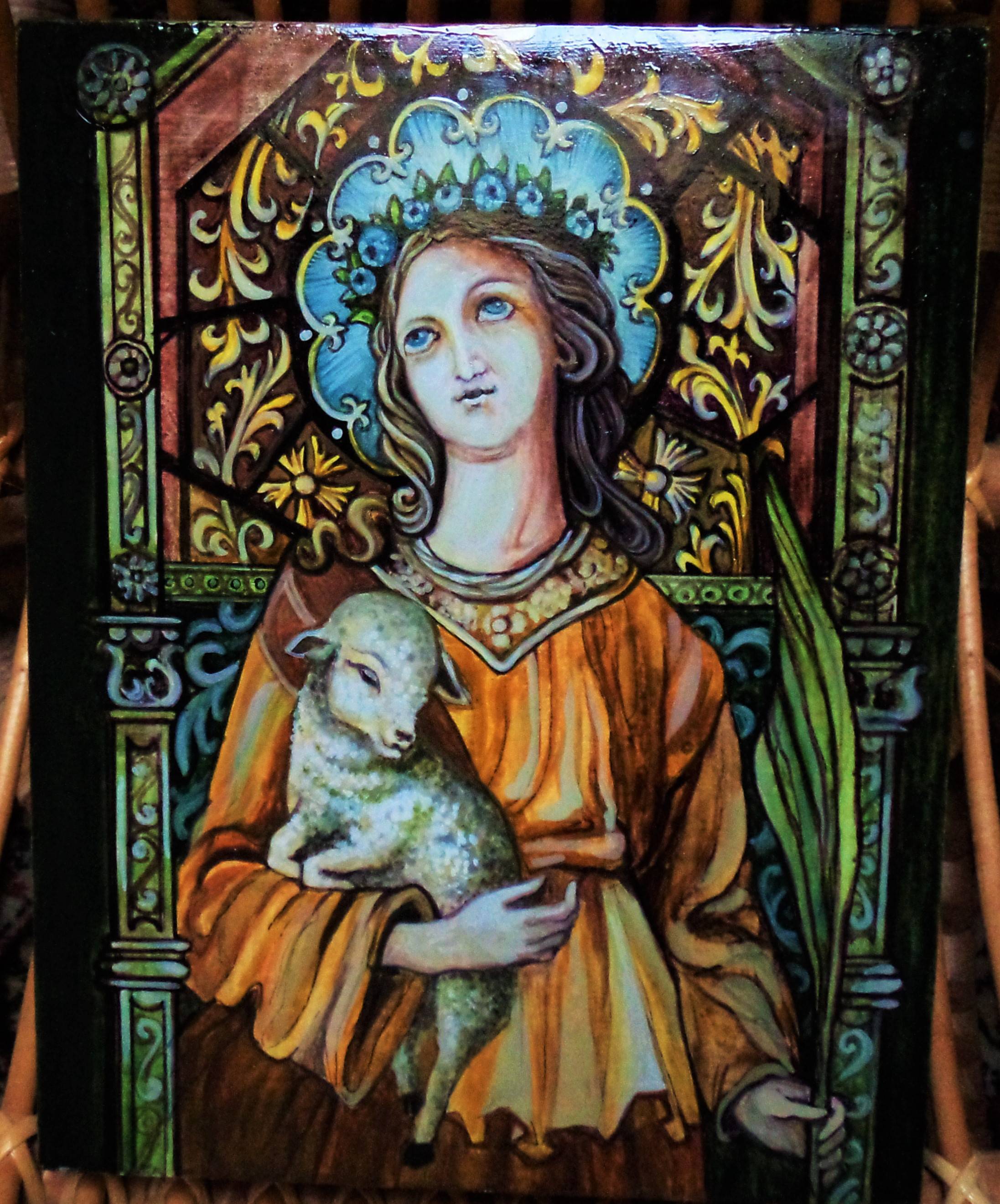Obraz namalowany na desce lipowej z dębowymi szpongami w technice tempery. Malunki pokryte werniksem damarowym końcowym. Obraz stanowi element kolekcji pt. "Święci na każdy dzień".