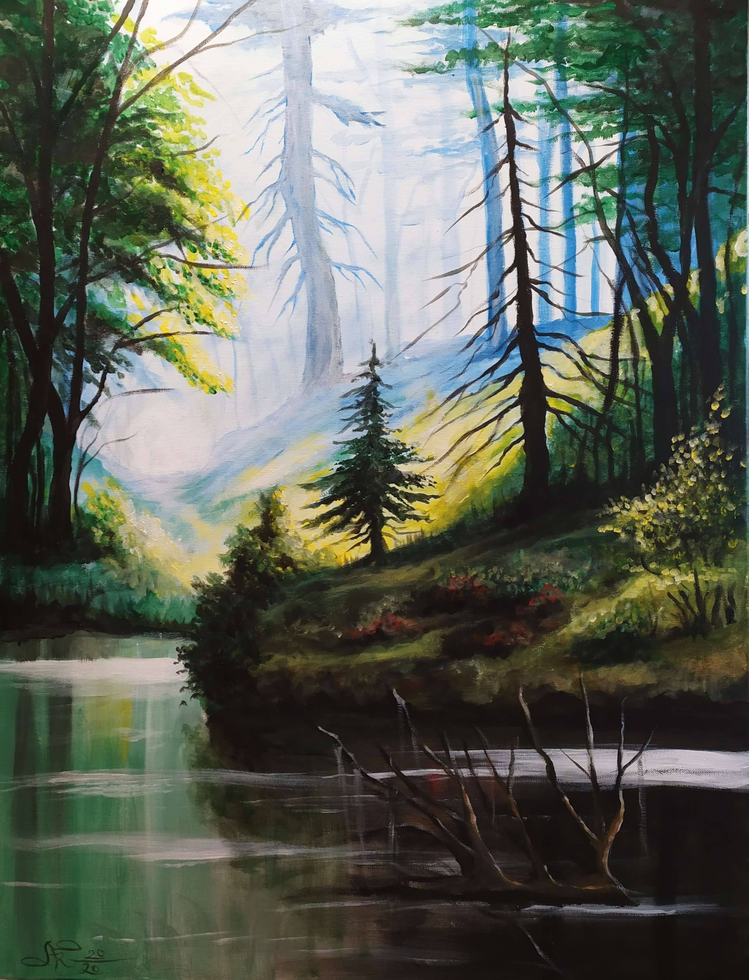 Ten obraz przedstawia spokojny zakątek leśny o poranku, kiedy mgła delikatnie unosi się nad ziemią. Dominują tu odcienie zieleni, kontrastujące z promieniami słonecznymi przenikającymi przez gałęzie drzew. Światło delikatnie oświetla małe drzewka i czerwone kwiaty rosnące przy brzegach rzeki, tworząc atmosferę pełną ciszy i kontemplacji. Kolory są subtelne, ale wyraziste, jakby artysta użył gry świateł i cieni, aby oddać wyjątkowość tej chwili. Kompozycja jest harmonijna, prowadzona liniami drzew, które składają się w naturalny tunel. Obraz emanuje spokojem; przywołuje uczucie wyciszenia, jakby świat stanął na chwilę w miejscu i pozwala nam usłyszeć tylko szum liści i szept wody. Technicznie, przypomina to stylem malarstwo impresjonistyczne, z wyraźnym zamiarem uchwycenia ulotnego momentu. W mojej głowie pojawia się myśl, że chciałbym tam być, usiąść pod drzewem i zanurzyć się w tej nieskazitelnej naturze. To takie magiczne miejsce, jak z bajki, coś co po angielsku można by nazwać "enchanted". Gdy patrzę, myślę: "Chciałbym znaleźć takie miejsce i po prostu tam zasnąć". Obraz pobudza wyobraźnię, ale i uspokaja nerwy. Super przyjemność dla oka!