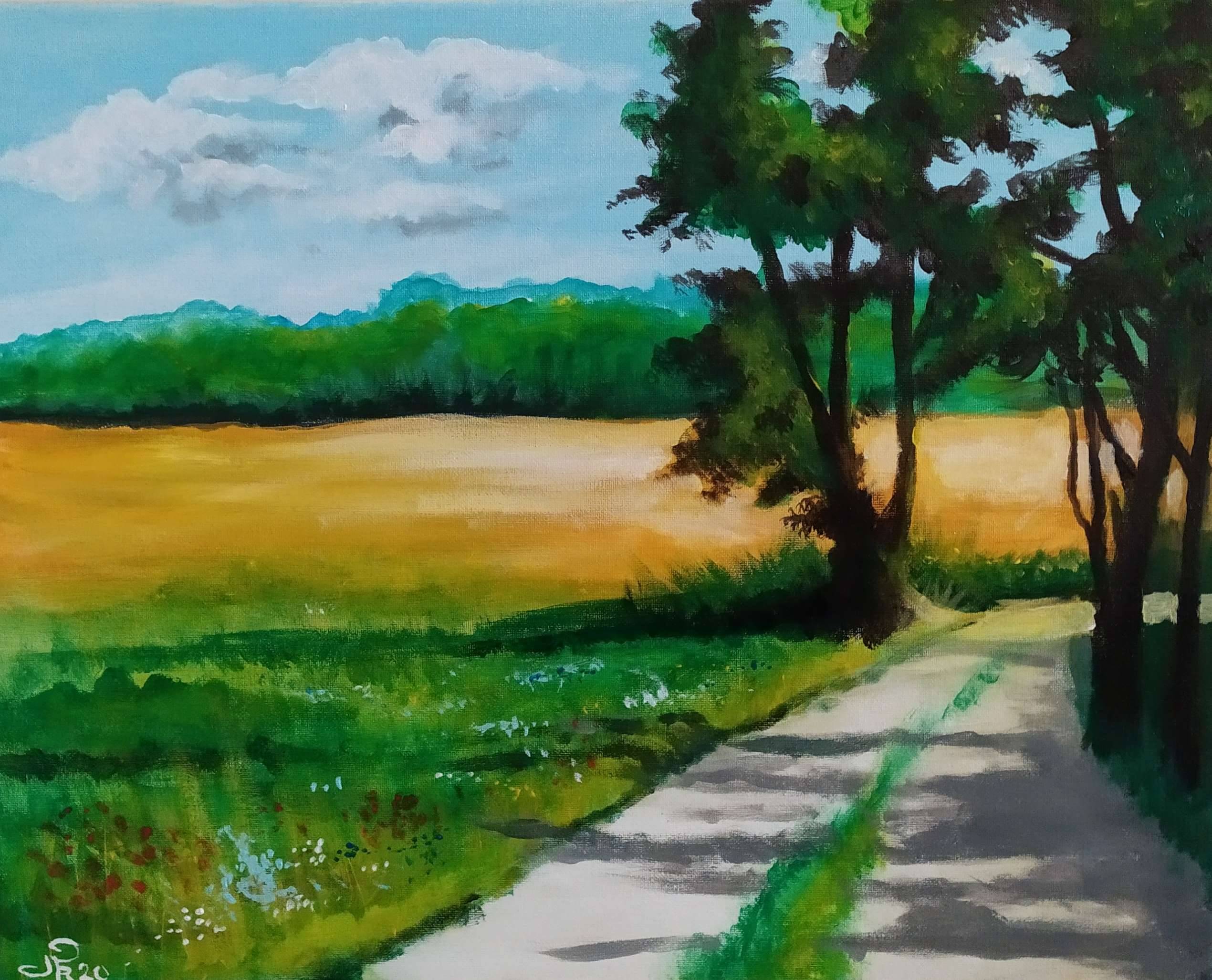 Na obrazie widzimy spokojną wiejską ścieżkę prowadzącą przez sielankowy krajobraz. Dominują tu zielone odcienie pól i drzew, zaś nad horyzontem unosi się błękit nieba z puszytymi chmurami. Pola tętnią życiem złocistych zbóż, tworząc żywą kontręstę z soczystą zielenią. Ścieżka, delikatnie wyłożona cieniem, nadaje obrazowi lekkości i głębi, prowadząc wzrok widza w dal. Obraz emanuje spokojem i harmonią natury, a ciepłe kolory dodają mu optymizmu. Artysta wybrał technikę akrylową, co widać po gładkich przejściach kolorów i dynamicznych pociągnięciach pędzla. Jest tu pewna swoboda, która przyciąga i zatrzymuje wzrok. Uwaga, to wręcz idylliczny widok, który może przypomnieć letnie spacery, gdy słońce muska twarz, a wiatr delikatnie bawi się włosami. "Patrz, ta droga prowadzi do sklepu z lodami!", mógłby powiedzieć mały chłopiec. Dzieło budzi tęsknotę za naturą i prostotą codziennego życia. To miejsce, gdzie można "breathe" pełną piersią i na chwilę zapomnieć o zgiełku miasta. Może to być przypomnienie o drobnych radościach życia, zachęcające do momentu refleksji i zatrzymania się na chwilę.