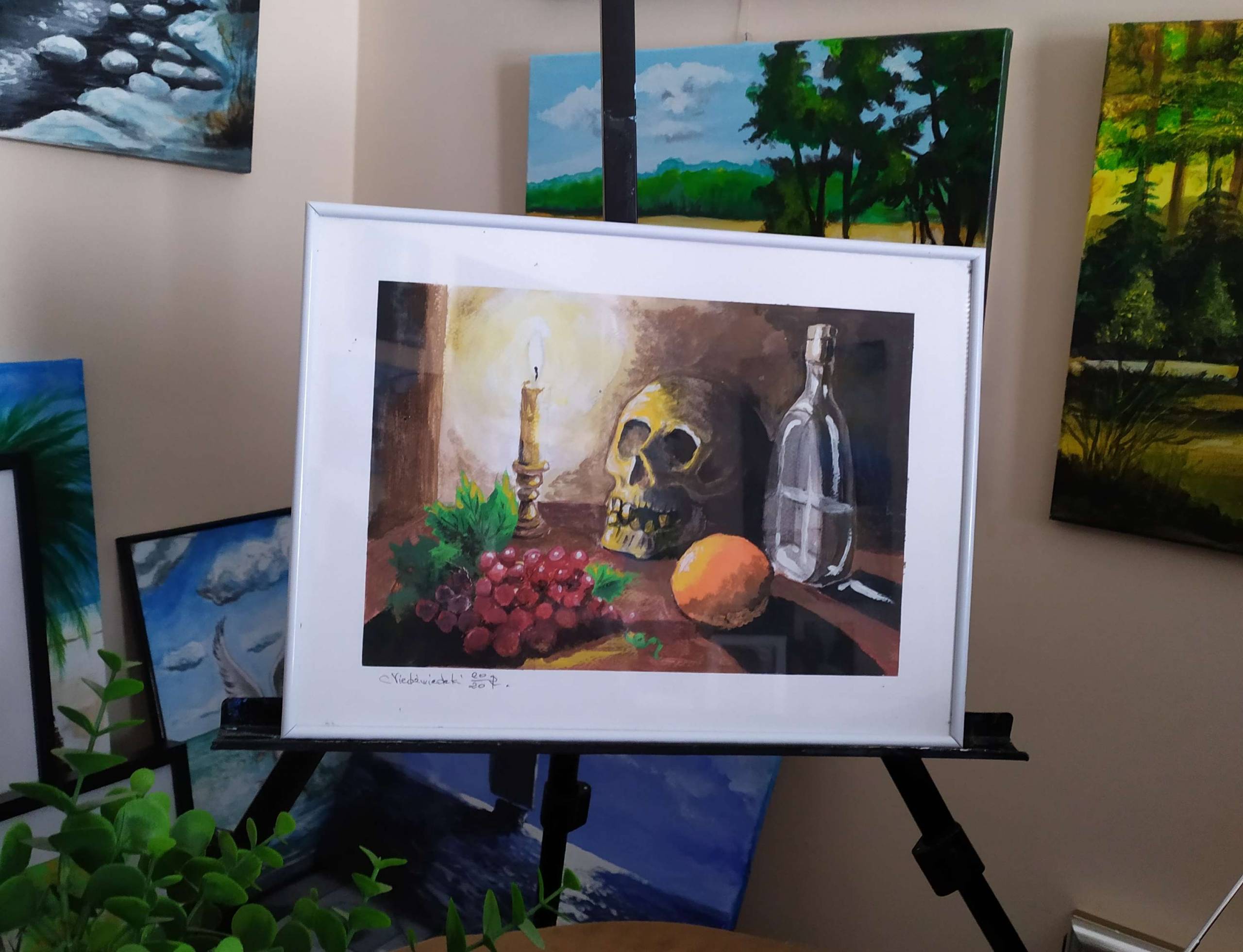Obraz emanuje tajemniczym, nieco mrocznym klimatem, w centrum którego znajduje się czaszka. Towarzyszy jej jasna świeca, grono czerwonych winogron i pomarańcza, a po drugiej stronie przezroczysta butelka. Całość jest utrzymana w kolorach ziemi, zdominowana przez brązy i złote odcienie, które tworzą nostalgiczną i refleksyjną atmosferę. Światło świecy subtelnie oświetla czaszkę, nadając kompozycji dramatyczny nastrój. Technika użyta przez artystę przypomina klasyczne martwe natury, z naciskiem na realistyczne detale i grę światła. Obraz może budzić wiele emocji i skojarzeń, od refleksji nad przemijaniem czasu do kontemplacji nad pięknem prostych przedmiotów. Kurczę, ten obraz naprawdę mnie porusza. Ma w sobie coś z tego "wow" efektu, który przyciąga wzrok. Tak jakby czas się zatrzymał przez chwilę. Mógłbym na to patrzeć godzinami, myśląc o życiu i jego kruchości. A dzieciak mógłby powiedzieć: "Patrz, czaszka, ale fajna!" Cała kompozycja sprawia wrażenie starannej przemyślenia, gdzie każdy element ma swoje miejsce i znaczenie.