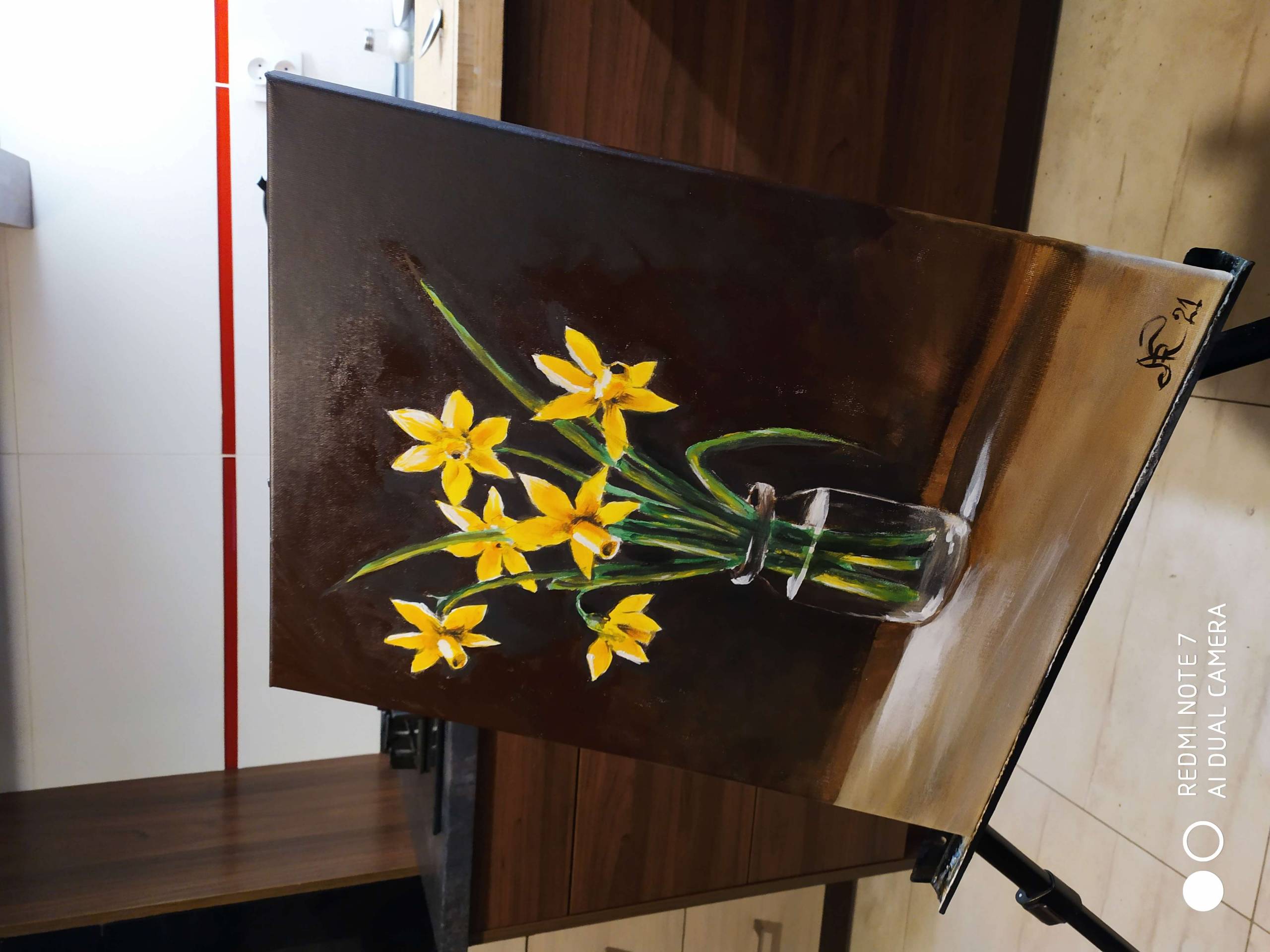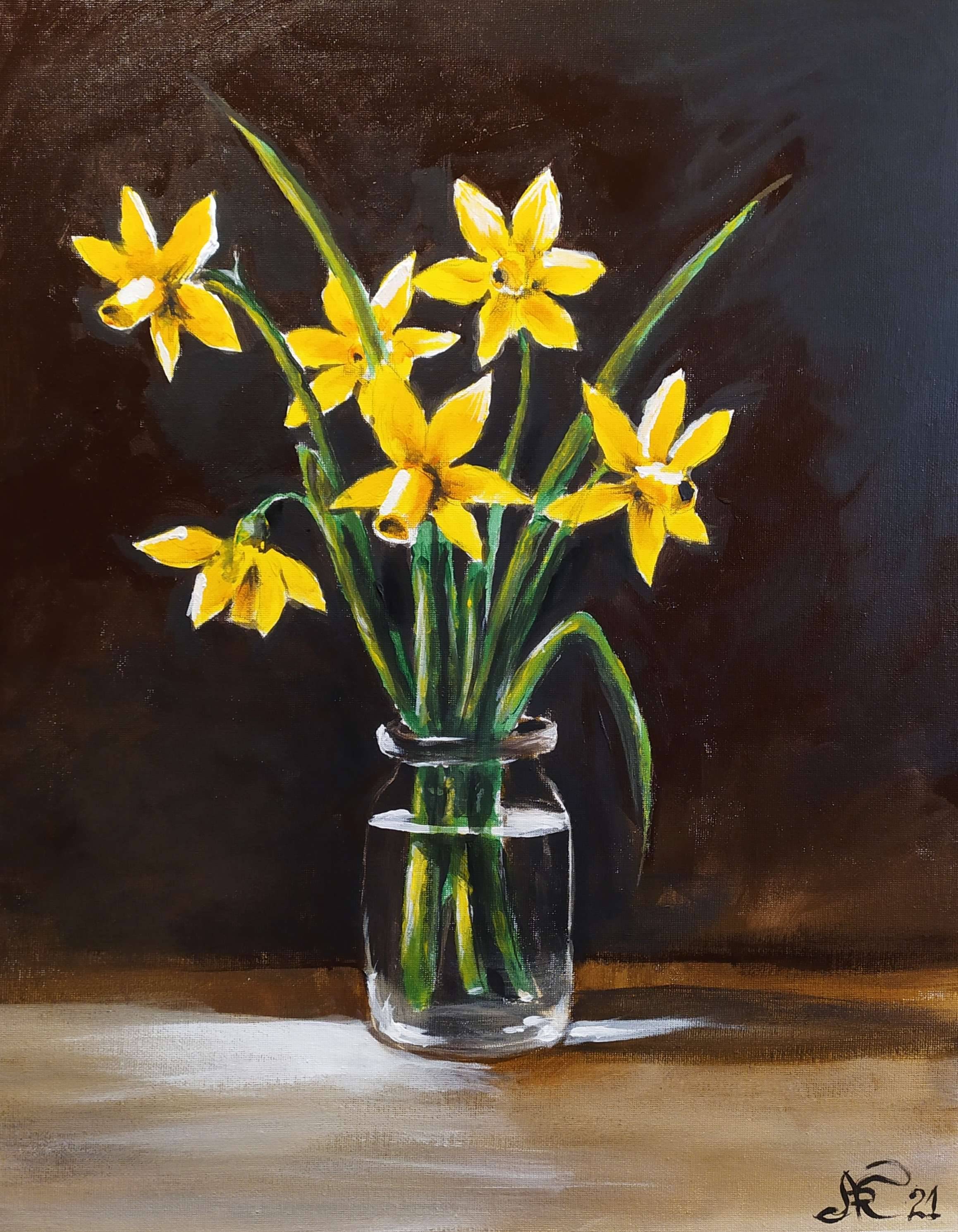 Na obrazie widać bukiet żółtych narcyzów w szklanym wazonie, który stoi na ciemnym tle. Kolory są pełne życia - soczysta zieleń łodyg i intensywna żółć kwiatów kontrastują z tłem, dodając głębi i elegancji. Kompozycja jest prosta, a jednocześnie pełna wdzięku. Kwiaty są w centralnym punkcie, co podkreśla ich delikatność i naturalne piękno. Atmosfera obrazu jest spokojna, niemal medytacyjna, jakby czas się zatrzymał, byśmy mogli cieszyć się chwilą. Malarskie pociągnięcia pędzlem wskazują na delikatną technikę artysty - możliwe, że to akryl albo olej na płótnie. Prosta forma i subtelne światło przynosi na myśl sielskie obrazy impresjonistów. Ten obraz może wywołać uczucie nostalgii i ciepła, jak wspomnienie wiosennego poranka. „To jest słońce w słoiku!” - powiedziałoby dziecko, podziwiając kolory. Light and warmth z wazonu emanuje na cały pokój. Takie dzieło sprawia, że człowiek chce zatrzymać się na chwilę, wziąć głęboki oddech i uśmiechnąć się do siebie. To jakby artysta uchwycił moment zanurzenia w chwili spokoju i prostoty. Coś pięknego i prawdziwego na wyciągnięcie ręki.