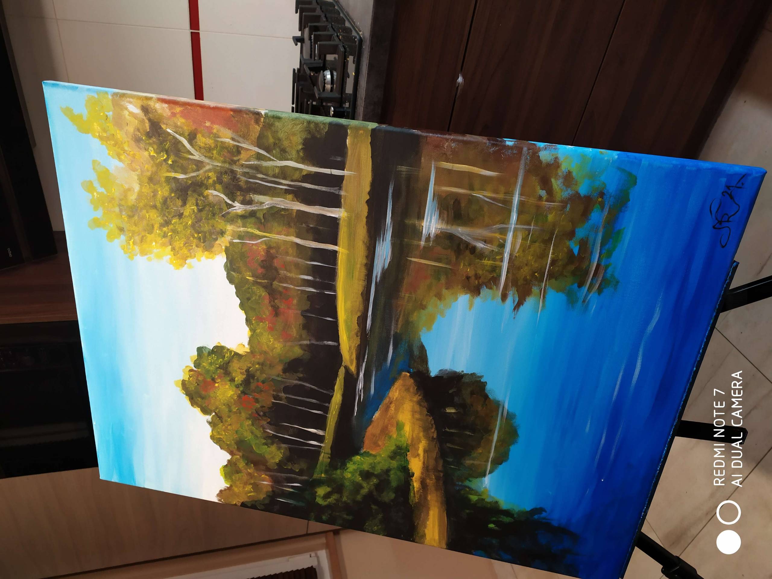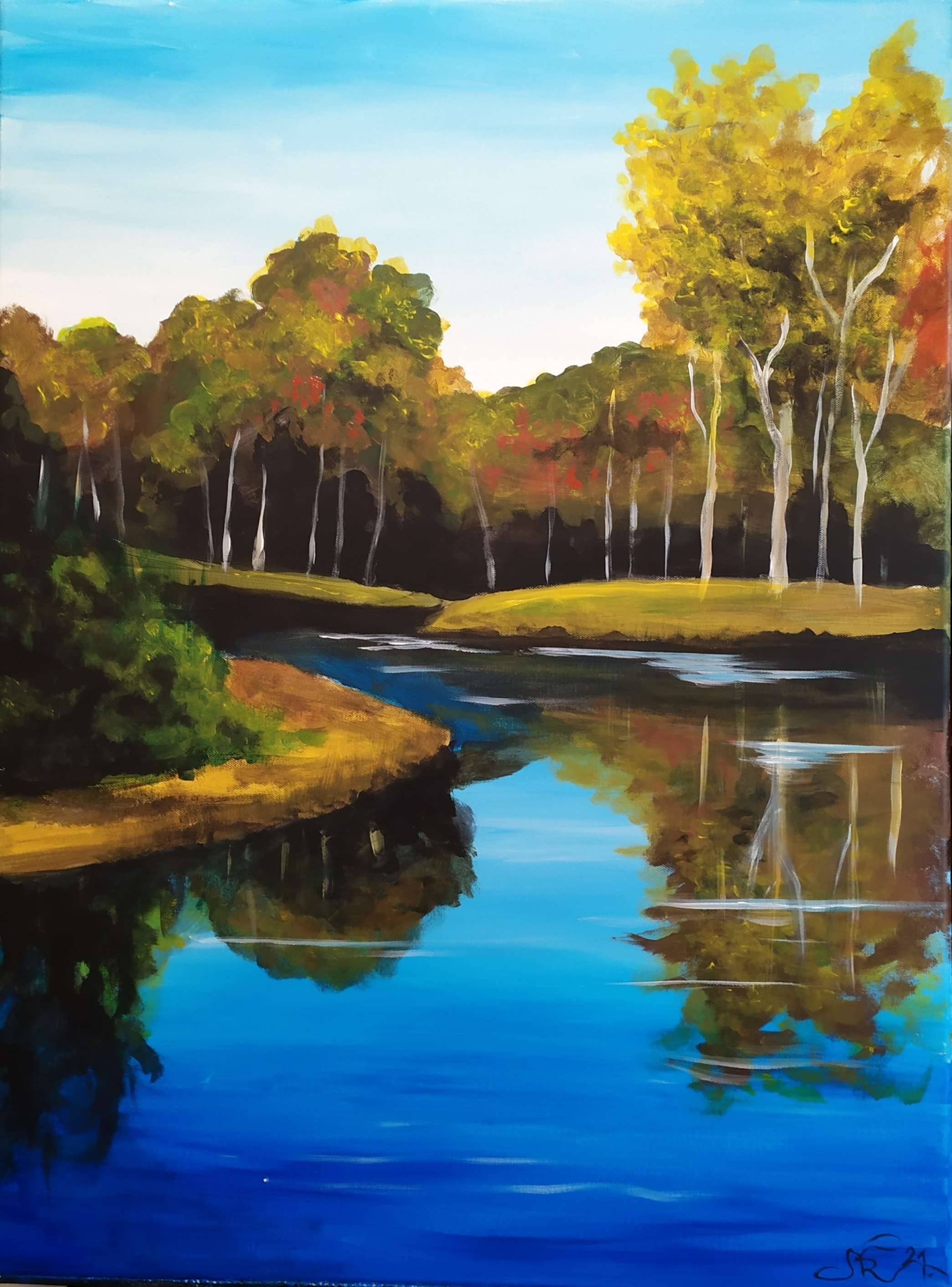 Na tym obrazie widać malowniczy krajobraz z rzeką otoczoną przez drzewa w cudownych jesiennych barwach. Niebieskie niebo i jego odbicie w wodzie nadają scenie spokojny i relaksujący nastrój. Drzewa są pełne kolorów, od zieleni przez żółcie do ciepłych odcieni pomarańczy. Kompozycja obrazu prowadzi wzrok widza wzdłuż krętego brzegu rzeki, kierując uwagę ku horyzontowi. Namalowane w sposób lekko rozmyty, dodają dynamiki i życia. Artystyczny styl artysty jest pełen ekspresji. Zastosowanie techniki impasto daje teksturę i głębię krajobrazowi. Czuć niemal physical obecność przyrody. Mimo że kompozycja jest prosta, emanuje z niej emocjonalna głębia, która zachęca do refleksji nad spokojem i pięknem natury. Kiedy patrzę na ten obraz, czuję się jak na spacerze wśród drzew w słoneczny dzień. "Dlaczego woda jest taka niebieska?!" zapytało by dziecko. I właśnie ta prostota ujęcia sprawia, że obraz jest tak engaging. W samym środku tego wszystkiego, jego kolorystyka wywołuje radość i nostalgiczne wspomnienia, a technika ukazuje delikatność i siłę natury. Każda linia i kolor zdają się opowiadać historię, a widz zostaje zachęcony do jej odkrywania na nowo z każdym spojrzeniem.