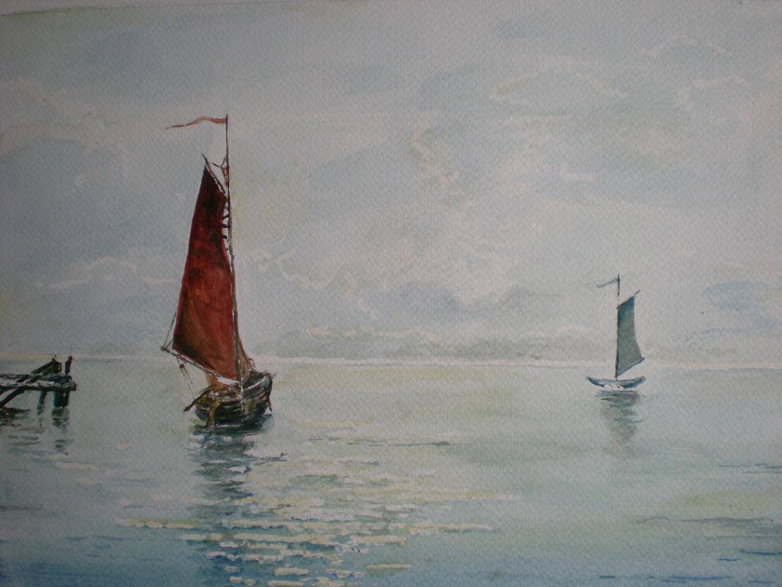 obraz przedstawia łodzie żaglowe na morzu - o swicie