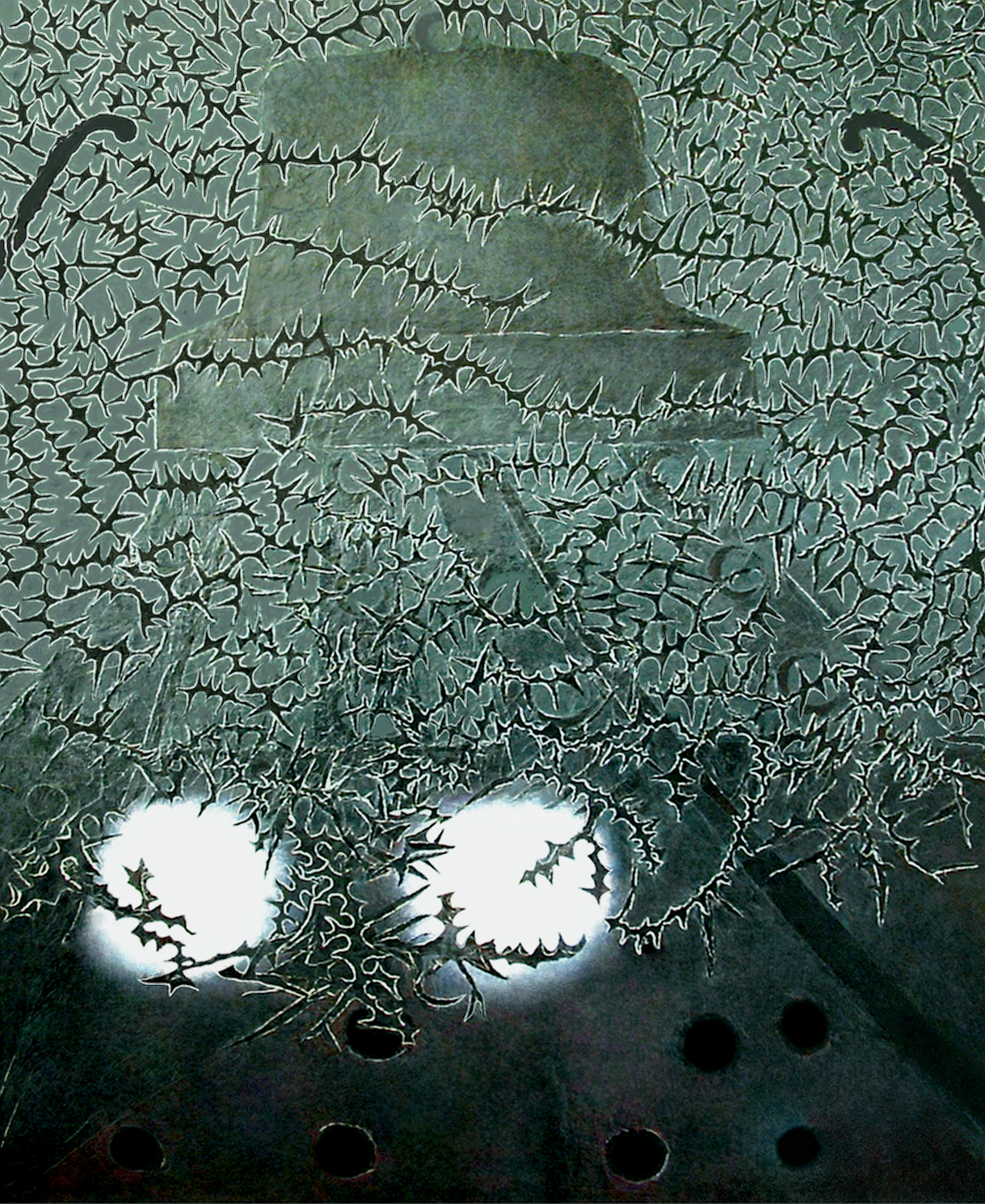 Obraz, który przyciąga wzrok, pełen jest mrocznych, zielono-szarych tonów. Kształty wiją się i plączą, tworząc coś w rodzaju zamglonego pejzażu, gdzie liście zdają się tańczyć wokół ledwo dostrzegalnej sylwetki. Atmosfera wydaje się wręcz magiczna, trochę jak w bajce o tajemniczych lasach i ukrytych stworzeniach. Styl artysty to mix surrealizmu z symbolizmem, a każdy szczegół jest delikatnie niewyraźny, jak sen na jawie. Ten obraz może wzbudzić uczucie niepewności, jakbyś był świadkiem czegoś zakazanego. A te czarne dziury na dole? Mogą wywołać wrażenie, że coś z tej mrocznej przestrzeni lada moment się wyłoni. Ciekawość miesza się z niepokojem. Co za obrazy! Na pewno warty uwagi. Co jeszcze można tutaj dostrzec, kiedy już sobie odpuścisz kontrolę? Magia.