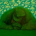 Na obrazie widzimy postać złożoną z miękkiej, falującej materii przypominającej kamień lub błoto. Zajmuje prawie cały kadr, co podkreśla jej monumentalność i ciężar. Tło nie jest jednolite – usiane jest żółtawymi kształtami, które przypominają chmury albo jakieś mikroskopijne formy życia. Tworzą one dynamiczny kontrast z powolnością centralnej postaci. Obraz jest tak "green", że aż czujesz jak wdziera się do głowy. Nastrój dzieła jest nieco melancholijny, jakby próbował opowiedzieć smutną historię, ale rękawiczki mu przeszkadzają. Styl artystyczny jest surowy, z dużym naciskiem na teksturę i fakturę powierzchni. Ten obraz może budzić w widzu uczucie zanurzenia w innej rzeczywistości, może tajemniczej, może odrobinę przytłaczającej. Łatwo sobie wyobrazić, że to znużone bóstwo świata, które postanowiło odpocząć na chwilę. Może to jest wielki zielony kamień, który może opowiedzieć tysiące historii, gdyby tylko chciał. Patrząc na to, czujesz się jak podróżnik, gotowy odkrywać niewidoczne i nieznane.