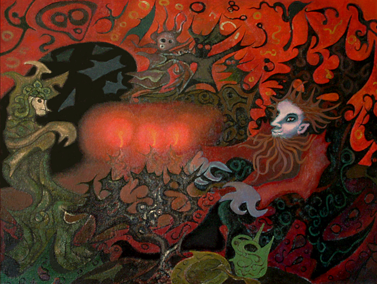 Obraz jest nasycony głębokimi kolorami. Kształty są organiczne, płynne, jakby nie miały określonych granic, a jednocześnie tworzą dynamiczny, baśniowy świat. Na pierwszy plan wysuwa się postać o błękitnej twarzy i dzikich włosach, która zdaje się unosić w przestrzeni, opowiadając swoją tajemniczą historię. Atmosfera obrazu jest zarazem bajkowa i nieco niepokojąca. Można w niej poczuć napięcie między światłem a ciemnością, między zabawą a grozą. Styl dzieła to surrealizm, z wyraźnymi wpływami sztuki psychodelicznej. Artysta korzysta z kontrastowych barw i odważnych linii, budując świat rodem z magicznych opowieści. Technika, chociaż złożona, wydaje się lekka, niemal taneczna. Obraz budzi wiele emocji – z jednej strony fascynuje, z innej zaś może nieco przerażać. To dzieło, które przyciąga wzrok, ale i skłania do refleksji. Gdzieś w kącie przewija się tajemnicza postać, może czarownik, a może leśne bóstwo. Dzieło ma ukryte znaczenia, które każą zastanowić się nad jego przesłaniem. Podsumowując, obraz emanuje intensywnością emocji, zaprasza do odkrywania ukrytych tajemnic i nie pozostawia odbiorcy obojętnym. Widząc go, czuje się wewnętrzne drżenie, jakby wstęp do niezwykłej przygody. Właśnie takie dzieła sztuki zostają w pamięci na długo.