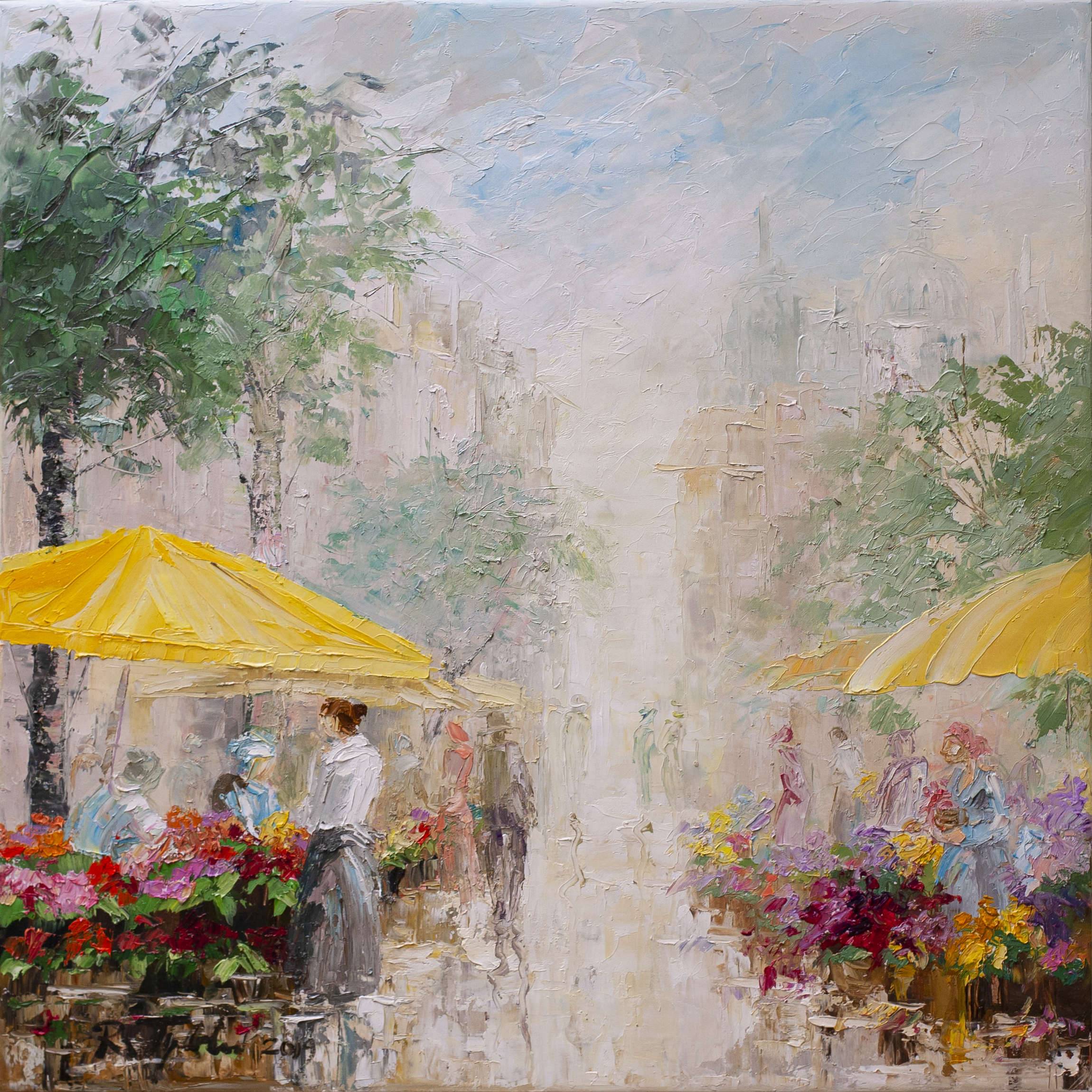 Obraz przedstawia spokojną uliczkę tętniącą barwami i szeptem codziennego życia. Na pierwszy plan wysuwają się jaskrawożółte parasole targowiska, pod którymi ukrywają się bogactwa kolorowych kwiatów. Dominują odcienie czerwieni, fioletu i zieleni, tworząc feerię barw, która przyciąga wzrok. Tło jest rozmyte, emanuje subtelną mgiełką, co dodaje scenie onirycznego klimatu. Artysta wykorzystał technikę impasto, nakładając farby grubo, co nadaje kompozycji fakturę i głębię. Nastrój obrazu jest sielankowy, pełen ciszy poranka, która przenika przez uliczki miasta. Można poczuć zapach świeżych kwiatów i usłyszeć stukot kroków na bruku. Styl ten przypomina impresjonizm, gdzie liczą się chwile i ulotne emocje. Obraz wywołuje uczucie spokoju, a także nutkę nostalgii za czasami pełnymi prostoty i ciepła. Dla mnie, spoglądanie na to dzieło to jak cofnięcie się do czasów dzieciństwa. Wyobrażam sobie, że mogłabym tam być, biegając między stoiskami. It feels timeless. Jeden z parasoli wygląda jak wielki słonecznik! Taka subtelna mieszanka barw, delikatności i niezaśmieconej przestrzeni sprawia, że jest coś magicznego w tej codziennej scenie, co sprawia, że chce się na chwilę zatrzymać i po prostu być obecnym.