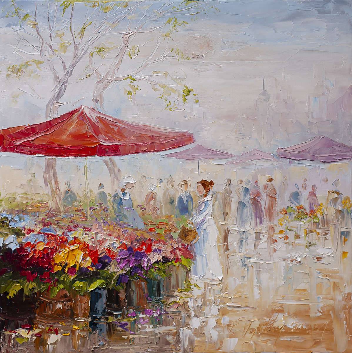 Obraz przedstawia urokliwy targ kwiatowy, w którym niemal czuć zapach świeżych róż i goździków. Kolory dominujące to ciepłe czerwienie i żółcie, które tworzą żywe kontrasty z pastelowym błękitem nieba i delikatnymi odcieniami zieleni. Kompozycja jest dynamiczna - duży czerwony parasol przyciąga wzrok, a wokół niego kręcą się sylwetki ludzi w eterycznych, nieco zamglonych konturach. To nadaje dziełu lekki, niemal impresjonistyczny charakter, gdzie światło i cień odgrywają główną rolę. Klimat obrazu jest sielankowy, spokojny, z nutą nostalgii. Oglądając dzieło, można poczuć się jakby się spacerowało w słoneczną sobotę między straganami pełnymi kwiatów. Artysta użył techniki impasto, co widać po grubo nałożonych plamach farb, nadających teksturę i głębię. Emocje, jakie budzi, to przede wszystkim radość i spokój; przypomina mi się dzieciństwo, kiedy wszystko wydawało się takie proste. Można by powiedzieć "what a peaceful scene!". Dla mnie ten obraz to oddech łagodnego powietrza w porannym blasku.