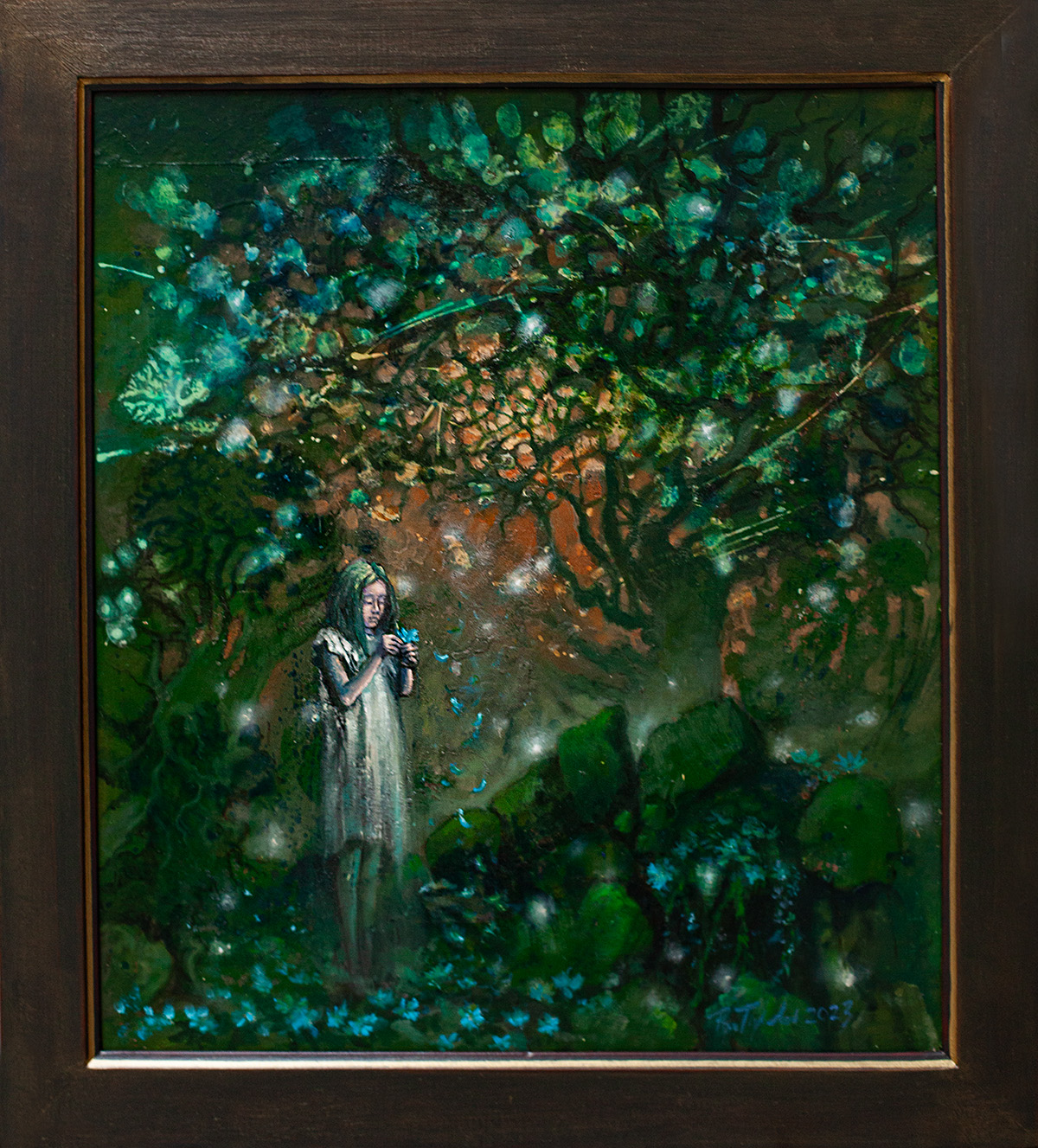 Obraz jest pełen magicznego blasku, zanurzonego w zielonym lesie, gdzie ciemne liście i jasne plamy świetlnych refleksów tworzą niesamowitą kompozycję. Niczym zaczarowany ogród, w środku tego wszystkiego stoi dziewczynka trzymająca delikatny kwiat. Jej biała sukienka kontrastuje z zielenią tła, dodając dziełu blasku i tajemniczości. Atmosfera jest spokojna, lecz jednocześnie nieco tajemnicza, jakby za chwilę miał tam wydarzyć się coś niezwykłego. Wow, to wygląda jak z bajki, myśli 7-latek, patrząc na obraz. Artysta zastosował technikę punktowania i rozmycia, co dodaje tekstury i głębi. Kolory są intensywne, jakby zanurzone w mgle. Przyglądając się, można poczuć nostalgię za dzieciństwem i ciekawość nieznanego. Praca ta może wzbudzić w odbiorcy wspomnienia o niewinnych zabawach w lesie. Ciekawie, jak jedno dzieło może przywołać tyle emocji. Styl jest nieco chaotyczny, a jednocześnie przemyślany. Jest jak nature's harmony, ucieczka w świat fantazji i nieuchwytnej magii. Patrząc na ten obraz, człowiek zatrzymuje się na chwilę w swoim szybkim tempie życia.