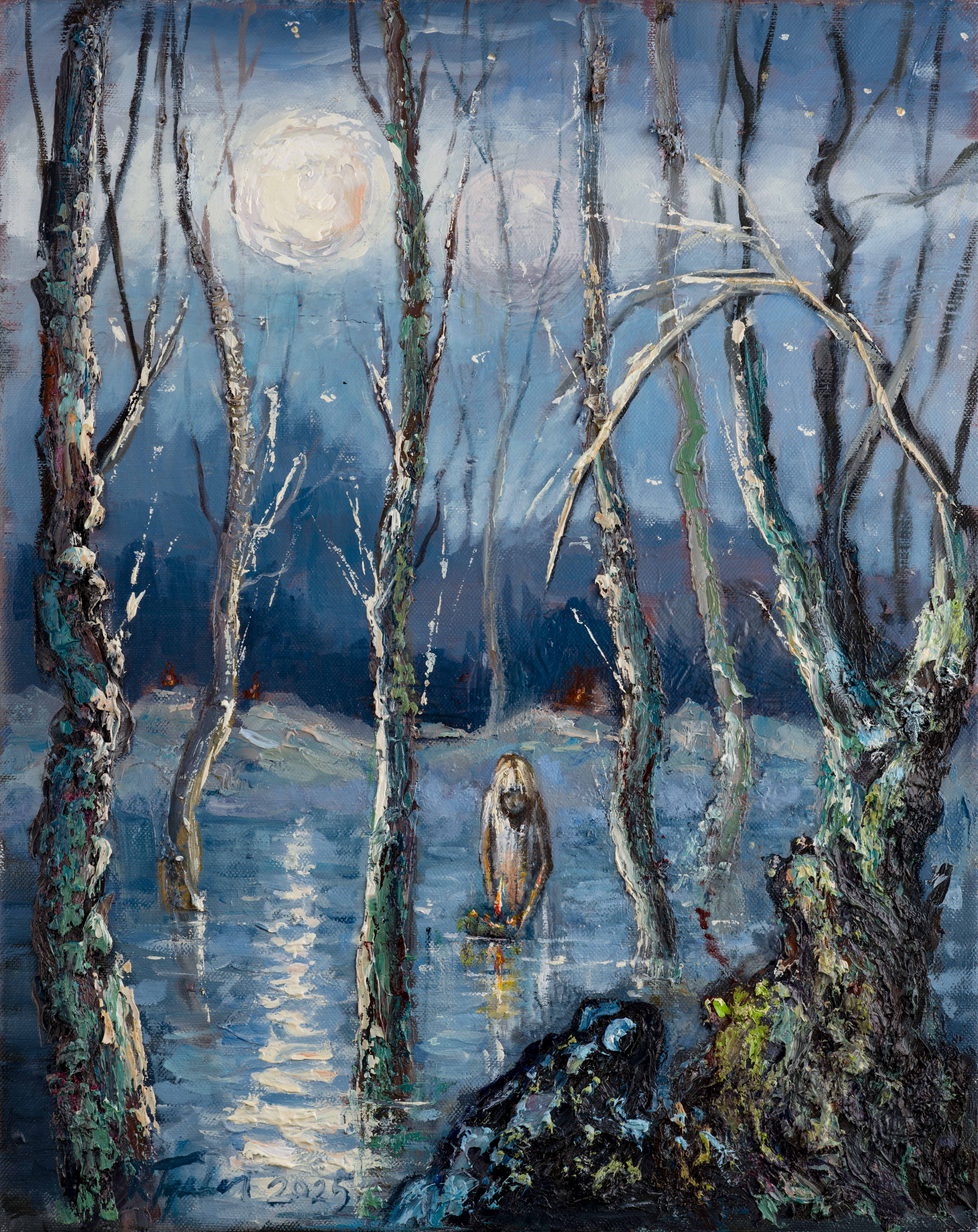 Na obrazie widać tajemniczy krajobraz nocny, gdzie srebrzysta poświata księżyca przebija się przez nagie konary drzew, tworząc melancholijną mozaikę cieni na wodzie. Dominują odcienie niebieskiego, zieleni i szarości, które potęgują uczucie chłodnego, mrocznego spokoju. Postać w centrum, prawie jak zjawa, siedzi na wodzie, otoczona ciszą, która zdaje się być wręcz namacalna. Kompozycja jest przemyślana i symetryczna, co wprowadza harmonię, ale także napięcie między spokojem a tajemnicą. Artysta użył impastu, dodając grubo nałożone warstwy farby, co nadaje obrazowi trójwymiarowości. Wydaje się, że pociągnięcia pędzlem są niemal chaotyczne, co daje dynamiczny kontrast.