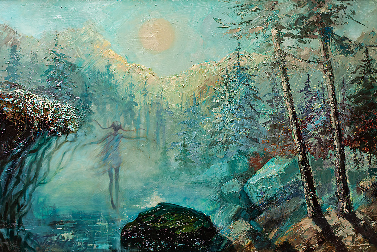 Na obrazie dominuje enigmatyczna aura lasu, w którym przeplatają się odcienie zieleni i błękitu. Drzewa, niczym strażnicy tajemnic, strzelają ku niebu, a pomiędzy nimi delikatna postać zdaje się tańczyć w mgle. Nienachalnie, w tle maluje się złotawy krąg przypominający zachodzące słońce, nadając całości ciepły, marzycielski charakter. Wykorzystane techniki impasto tworzą teksturę, która dodaje obrazowi dynamiki i głębi. Pociągnięcia pędzla są odważne, a jednocześnie subtelne, co sprawia, że całość pulsuje życiem. Ta scena wygląda jak z baśniowa kraina, prawie jak magiczna. Czujesz, jakbyś chciał tam wejść i poczuć chłód porannych oparów. Dziecięca wyobraźnia krzyczy: "Ojejku, tam mieszkają wróżki!". Dla dorosłych zaś, to chwila na refleksję nad pięknem i tajemnicą natury. Trochę jakby wszystko było "unreal", takie trochę nierealne, prawda? Emocje oscylują między spokojem a fascynacją, a całość składa się na obraz, który pozostawia trwałe wrażenie, zachęcając do chwilowego zatrzymania się i podziwiania piękna.