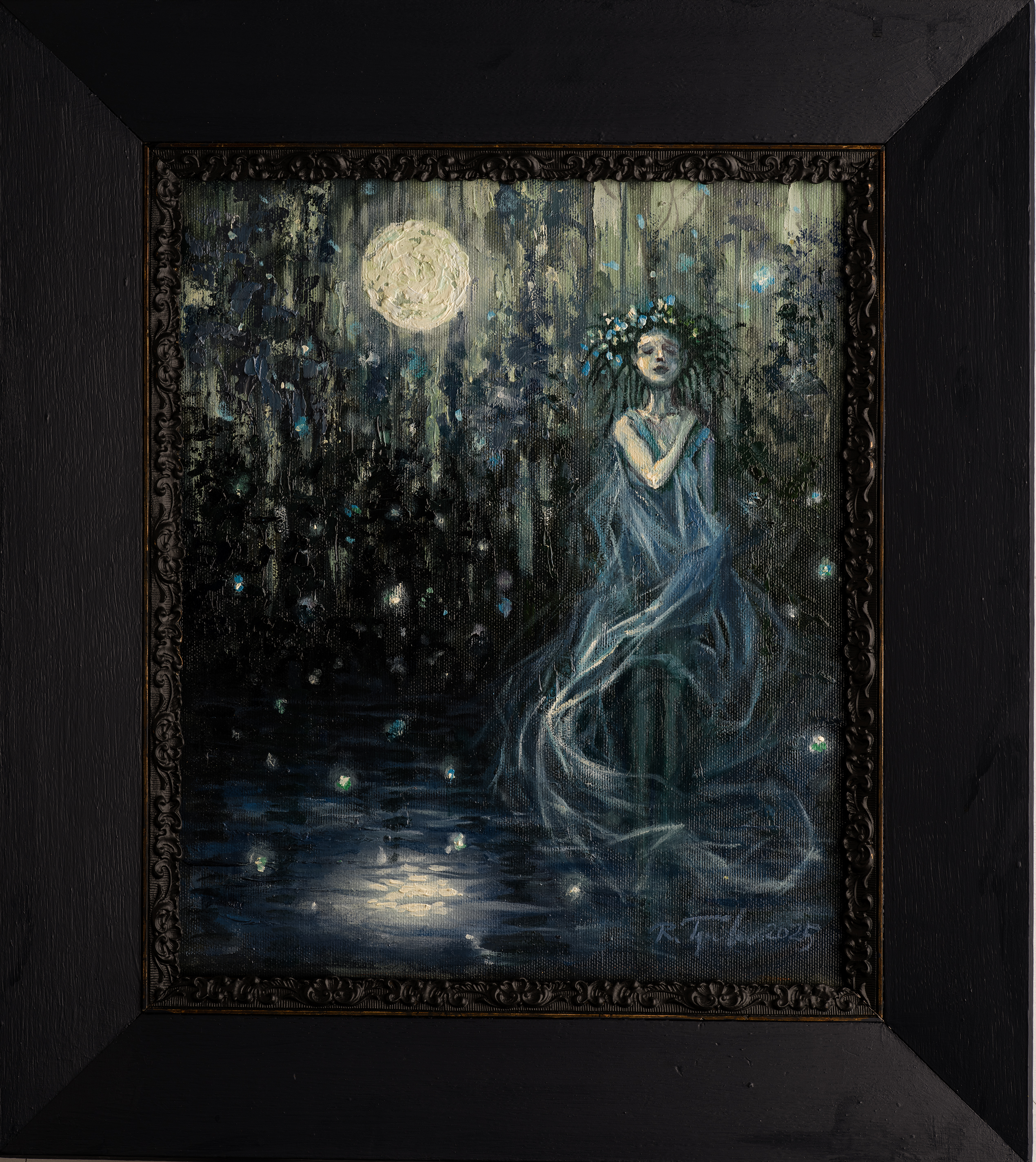 Na obrazie dominuje tajemnicza nocna scena. W centrum znajduje się eteryczna postać, owinięta w falujące, niebieskawe tkaniny, przypominająca ducha lub nimfę. Jej skóra wydaje się niemal przezroczysta w blasku księżyca, który dumnie wisi na niebie. To księżyc oświetla krajobraz swoim miękkim, złotawym światłem, rozpraszając mroki nocy. Otaczające ciemne zielenie i czernie nadają pracy głęboki, niemal mistyczny klimat. Jest tu mnóstwo drobnych punktów światła, jakby świat pełen był magicznych iskierek. Czuć w tym coś z baśni. Malarska technika jest tu dość swobodna, artysta używa szerokich, rozmazanych pociągnięć pędzla. Styl jest niemal impresjonistyczny, ale z nutką realizmu, co dodaje obrazowi wyjątkowej jakości. Ta magiczna atmosfera budzi we mnie nostalgię za jakimiś zapomnianymi opowieściami. Może to wszystko dzieje się w zaczarowanym lesie? Jak to sobie wyobrazisz, serce bije szybciej z podekscytowania. "Wow, ona wygląda jak księżniczka z bajki!" powiedziałoby dziecko z iskierką zachwytu. To ujęcie tajemnicy i piękna, zaklęte w prostocie i głębi jednocześnie, sprawia, że człowiek trochę zapomina o bożym świecie. I choć wszystko wokół tonie w ciemnościach, ta scena daje poczucie spokoju i refleksji. Czysta magia w obrazie.