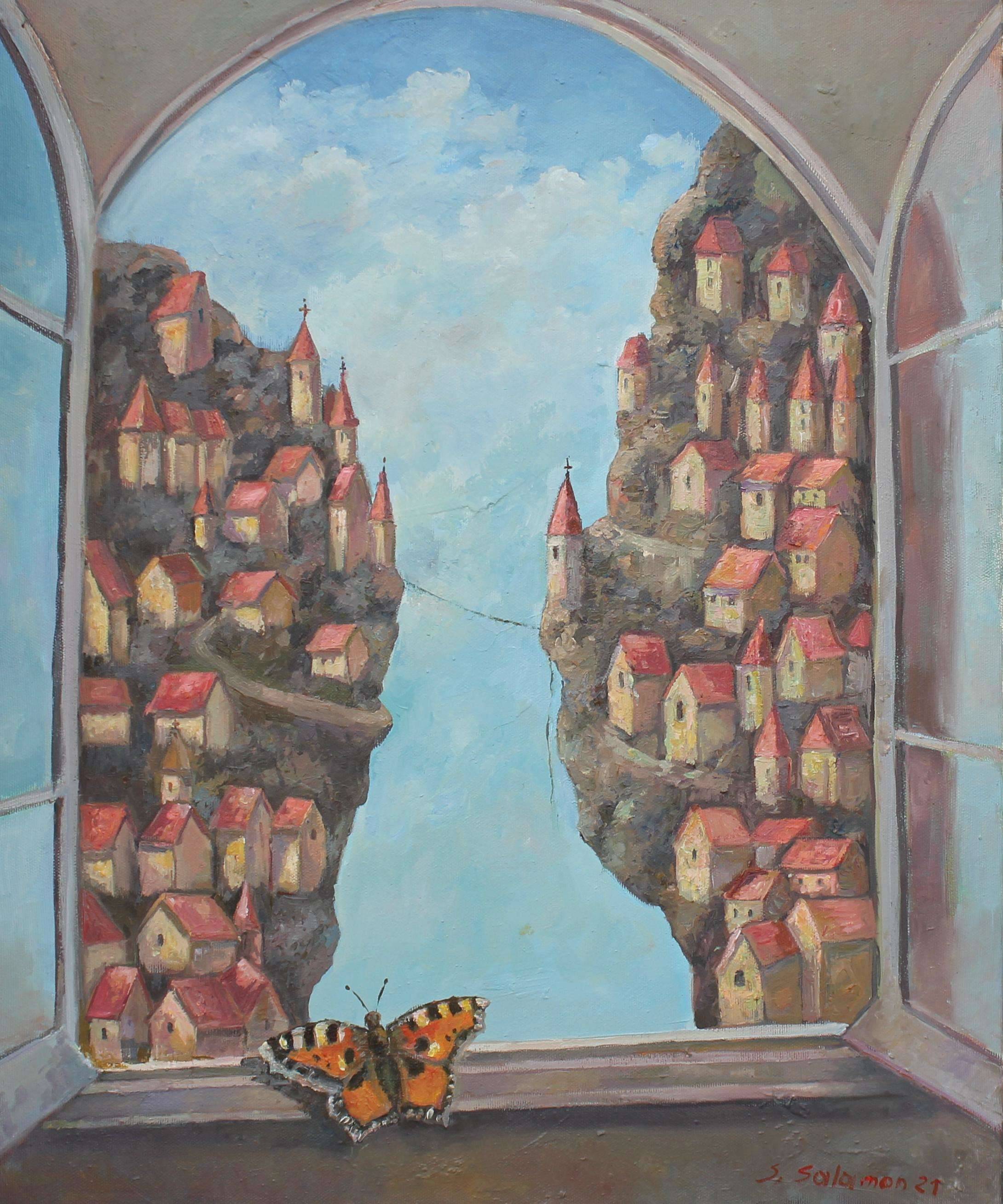 Obraz olejny namalowany z wyobraźni .Bajkowe miasteczko .