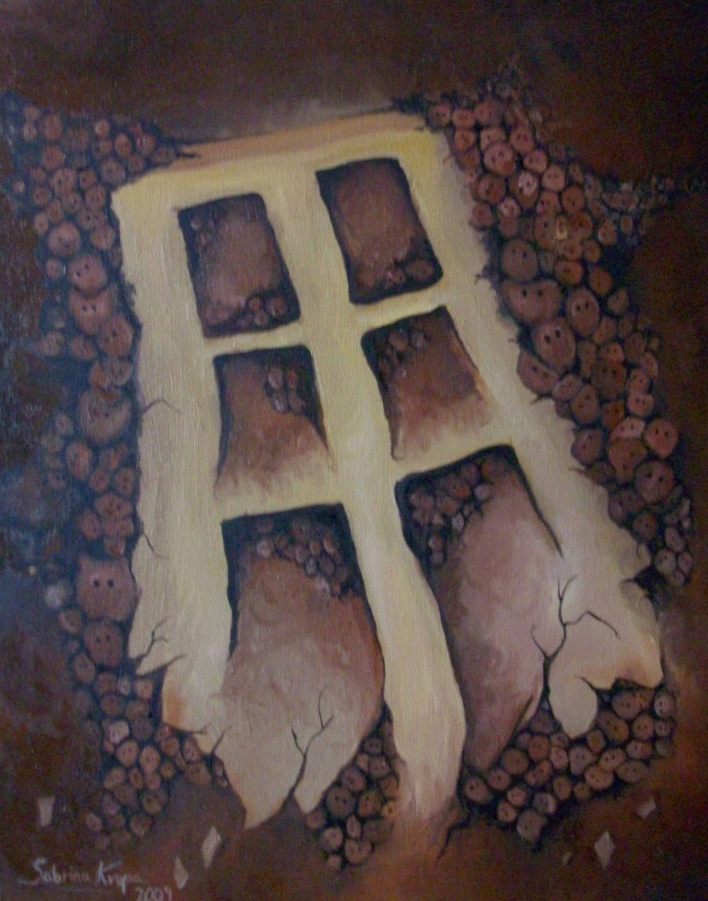 Obraz emanuje głębokim, ziemistym klimatem, w którym dominują ciepłe brązy i ochry. Centralny element przypomina literę "H" wykonaną z grubej, jasnej krechy. Wokół niej rozpościerają się nieregularne, brunatne formy, które tworzą ciekawą kompozycję. Wygląda to jak zarysowana mapa tajemniczych układów korzeni w ziemi. Brzegi wypełniają drobne, organiczne kształty przypominające małe guzki lub kropki, jakby były to krople z ziemi wznoszące się w górę. Atmosfera przypomina senne wyobrażenia, w których rzeczywistość miesza się z wyimaginowanymi obrazami. Uspokajająca aura płynąca z obrazu wprowadza pewien rodzaj wewnętrznego spokoju, ale też wzbudza lekką ciekawość. "Patrz, drzewo!" mogłoby zawołać dziecko, wskazując na abstrakcję, która przypomina splątane gałęzie. Artysta zastosował techniki impresjonistyczne, eksperymentując z teksturą i grubością farby, co nadaje dziełu dynamiczność. Obraz może skłaniać odbiorcę do przemyśleń, do zastanowienia się nad tym, co ukryte jest pod powierzchnią. Mamy tu trochę "mystery", zagadkowego nastroju, który intryguje i pociąga. Widz, oglądając dzieło, może poczuć lekkie zaniepokojenie, ale i fascynację nieznanym. Zastanawiam się, co artysta miał na myśli, malując to. Może symbolizuje to drogę do wnętrza siebie? Kto wie. Trudno się oprzeć pokusie, by nie odczytywać tej pracy jako metafory życia, chwilami nieprzewidywalnego i skomplikowanego w swojej prostocie.