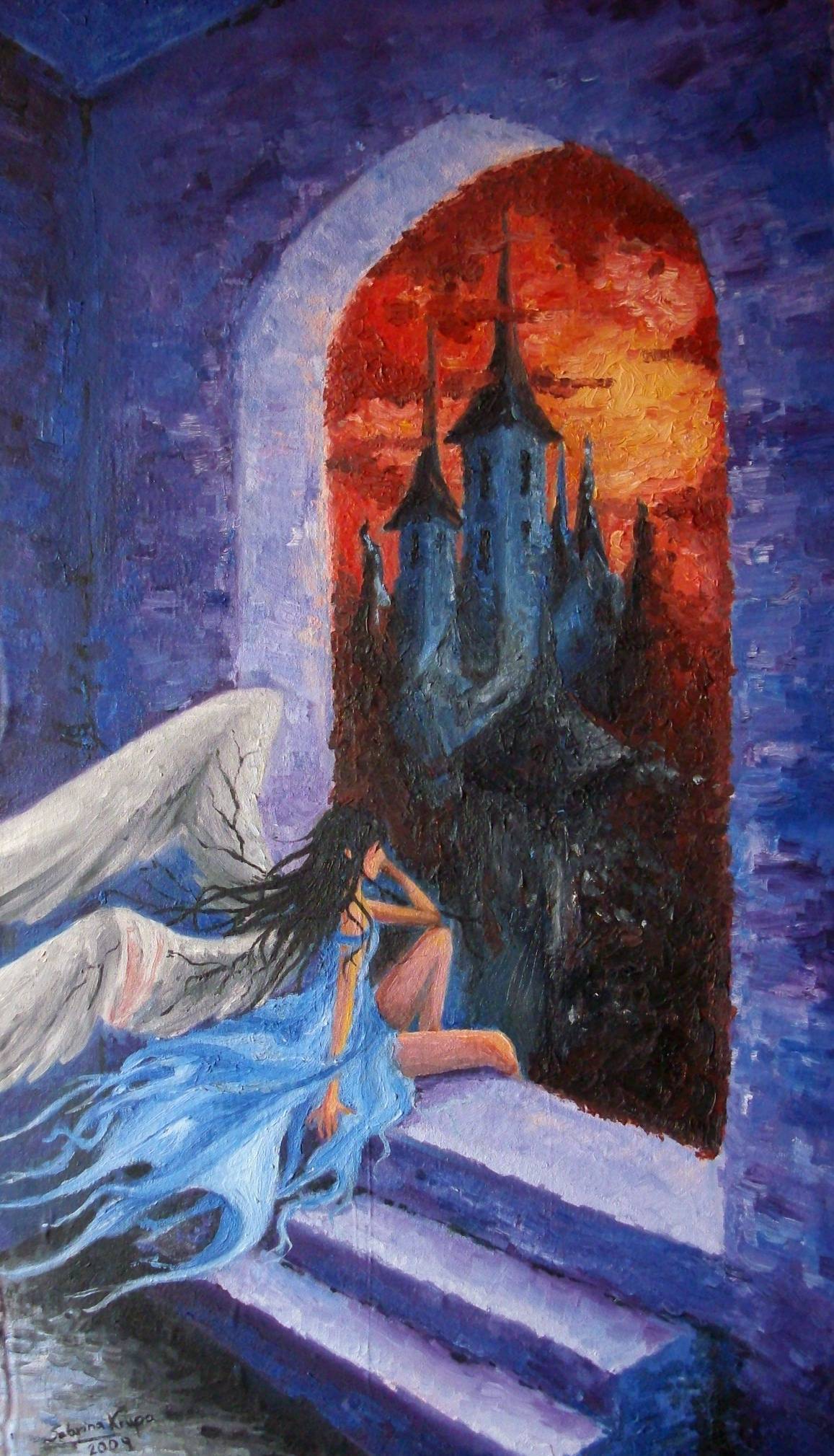 Na obrazie widzimy tajemniczą scenę pełną magii i niepewności. Dominuje tu intensywny kontrast między ciepłymi czerwono-pomarańczowymi kolorami zachodu słońca a chłodnymi, niebiesko-fioletowymi tonami. Centrum kompozycji przyciąga odległy zamek, którego wieże przebijają płonące niebo, tworząc atmosferę pełną dramatyzmu. W pierwszym planie siedzi postać z długimi, czarnymi włosami, ubrana w błękitną, zwiewną suknię. Jej skrzydła są delikatnie ułożone na kamiennych schodach. Wygląda na zamyśloną, jakby marzyła o świecie za oknem. Obraz emanuje tajemniczym, trochę mrocznym nastrojem. Styl artystyczny zdradza ślady romantycznego impresjonizmu, gdzie szerokie pociągnięcia pędzla budują strukturę, a kolory niemal pulsują z płótna. There's a sense of longing in the scene, który może wywołać refleksję nad tęsknotą za czymś nieosiągalnym. Patrząc na ten obraz, można poczuć się jak w baśni, gdzie rzeczywistość miesza się z marzeniami. Czuję się zaintrygowany, wręcz zauroczony magiczną aurą, która wita mnie z każdym spojrzeniem. Ja bym chciał tam polecieć. Obraz tętni emocjami, które inspirują do własnych interpretacji. To dzieło sztuki stanowi portal do innego świata, gdzie rzeczywistość i fantazja splecione są w fascynującej harmonii. Zaskakuje i porywa, zmuszając do zatrzymania się na chwilę i zatopienia w głębi tej wizualnej opowieści.