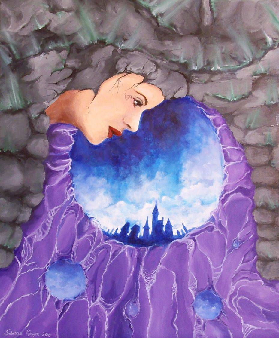 Obraz zachwyca intensywnością kolorów i niezwykłym połączeniem elementów realistycznych z surrealistycznymi. Centralną część kompozycji zdobi twarz kobiety, która zdaje się spoglądać przez otwór jak przez jakieś magiczne okno. Ściany obrzeża tego otworu są warto podkreślić w fioletach, które kontrastują z niebem pełnym odcieni błękitu i bieli. Zarys miasta na horyzoncie przypomina baśniowe zamki, dając wrażenie tajemniczości i magicznej głębi. Atmosfera jest nieco melancholijna, jakby postać zamykała w sobie jakieś głęboko skrywane tajemnice. Czuje się tu lekki powiew dream-like quality, gdzie rzeczywistość miesza się ze snem. Styl artystyczny jest miękki i płynny, pociągnięcia pędzla są delikatne, a kolory łączą się płynnie, tworząc harmonijną całość. Techniki mieszania farb dodają całemu obrazowi dodatkowej głębi. Dzieło może budzić u odbiorcy różne emocje. Może to być nostalgia za czymś utraconym lub fascynacja nieznanym światem. Dla mnie, obraz przypomina dzieciństwo, gdzie wszystko było możliwe, a wyobraźnia nie miała granic. „A ja tam byłem w bajkowym królestwie” – tak mogłoby powiedzieć dziecko. Każdy detal wydaje się szepczącą opowieścią, którą trzeba odkryć indywidualnie. Patrząc na ten obraz, czuję wewnętrzny spokój, przyjemnie się zgubić w tej wizualnej narracji.