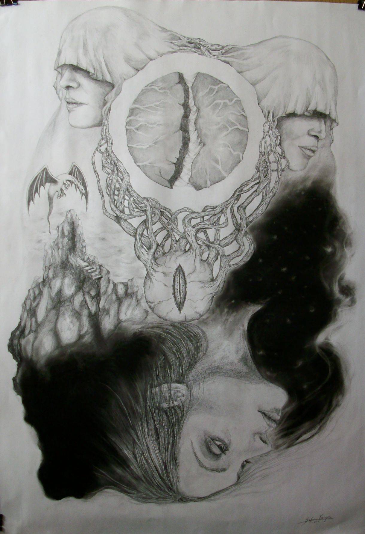 Obraz jest pełen kontrastów i tajemnicy, które przyciągają uwagę od pierwszego spojrzenia. Dominują chłodne odcienie szarości, czerni i bieli, co nadaje mu nieco oniryczny charakter. Kompozycja jest złożona, centralnie umieszczono coś przypominającego mózg, otoczonego wijącymi się korzeniami lub liniami. Dwie zakapturzone postacie po bokach dodają całości mistycyzmu, a ich zamknięte oczy budują atmosferę skrytych myśli czy snów. Mały smok na tle góry w prawym dolnym rogu wprowadza element surrealizmu i baśniowości. Artysta zastosował techniki kreskowania, które nadają teksturę i głębię poszczególnym elementom. Dzięki temu rysunki postaci wydają się na poły rzeczywiste, na poły fantastyczne. Całość może wywoływać różnorodne emocje, od niepokoju, przez wzruszenie, po fascynację. "To wygląda jak z bajki!" - mogłoby powiedzieć dziecko. I faktycznie, ta praca ma w sobie coś magicznego. To prawdziwy feast for the eyes, w którym każdy element kryje własną historię. Obraz sprawia, że można się w nim zatracić, próbując rozwikłać ukryte znaczenia i symbole. Jego kontemplacyjny charakter porusza coś głęboko w duszy, zachęcając do refleksji nad tym, co widoczne i tym, co ukryte.