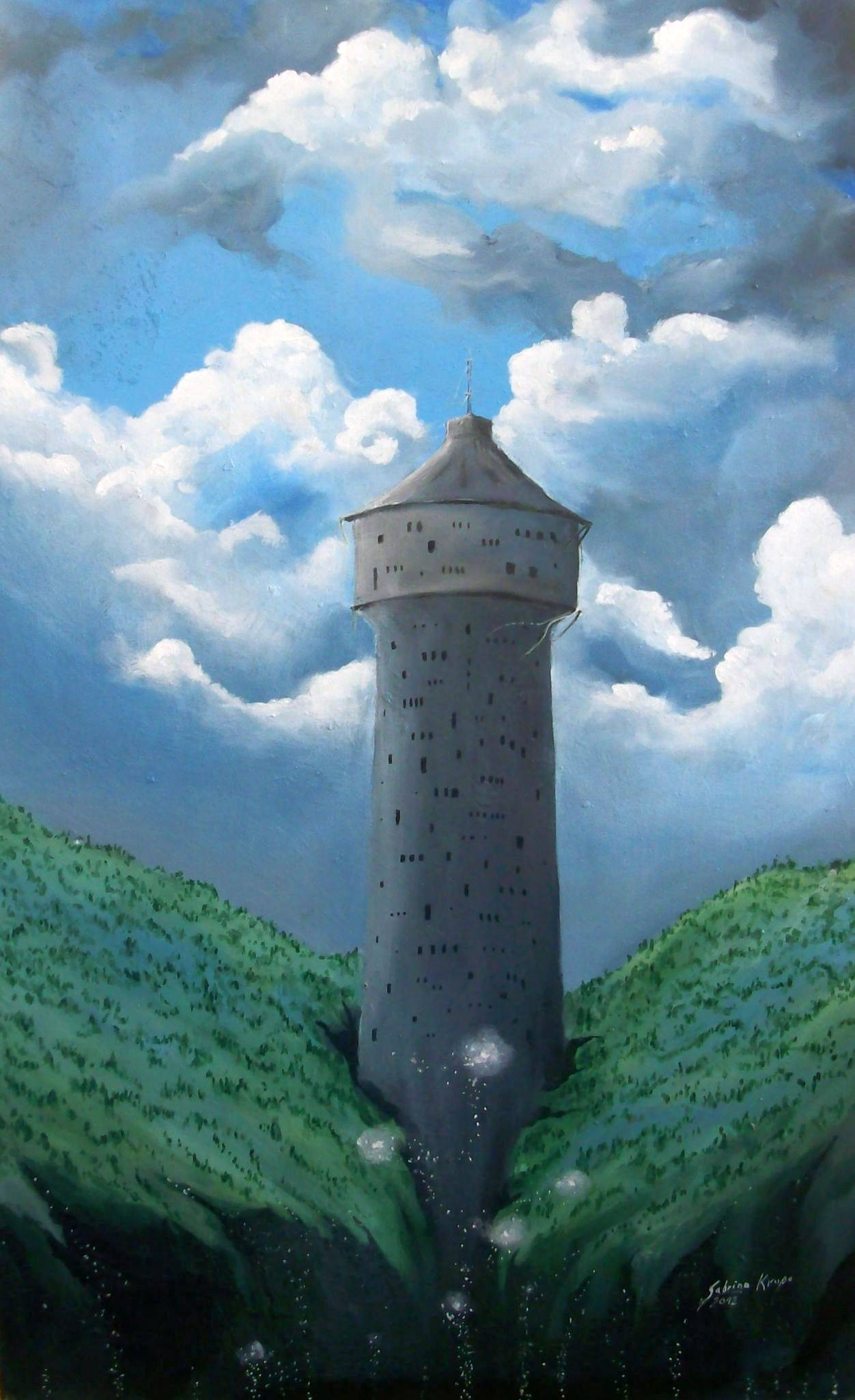 Obraz przedstawia majestatyczną wieżę wznoszącą się pośród soczystej zieleni, otoczoną przez bielejące na niebie chmury. Dominują tu odcienie niebieskiego i zielonego, kontrastując z szarością samej wieży. Kompozycja jest harmonijna, z centralnym punktem w postaci masywnej budowli, która niemal dotyka chmur. Atmosfera jest niezwykle spokojna, choć niebo sugeruje nadchodzącą burzę. Artysta użył techniki olejnej, z precyzyjnie nakładanymi pociągnięciami pędzla, które dodają obrazowi głębi i tekstury. Przypuszczam, że tworzenie tego dzieła mogło być wyzwaniem. Dzieło emanuje tajemniczością i nostalgią. Wieża, niczym strażnik czasu, zdaje się opowiadać historię minionych wieków. Wywołuje to we mnie poczucie odnalezienia spokoju i tajemniczego przyciągania. Ciekawe, czy ktoś mógłby się tam wspiąć i co zobaczyć z góry? Obraz mógłby wzbudzać różne emocje u odbiorcy – od zachwytu po melancholię. Spoglądając na ten „tower”, można się zastanawiać, co kryje się w jego wnętrzu. Dzieci może powiedzieć: ojej, jaka wysoka wieża, jak w bajce. Fascynuje mnie, jak sztuka potrafi pobudzać wyobraźnię, tworząc własne historie.
