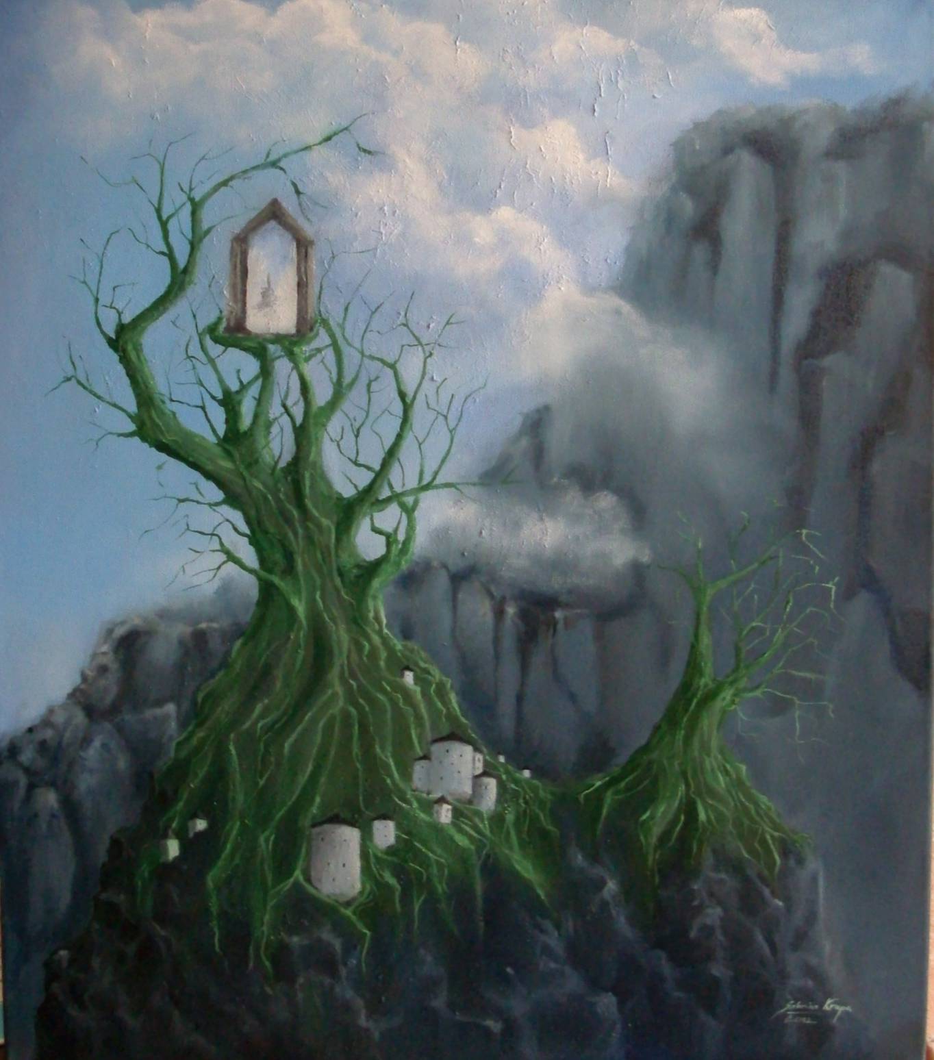Obraz jest pełen tajemniczych elementów, przyciągając wzrok swoją nietypową kompozycją. Dominujące kolory to zimne błękity i zielenie, które tworzą mistyczną atmosferę. Na pierwszym planie widzimy drzewo o zielonych, wijących się gałęziach, które przypomina coś z baśni. Dookoła niego rozciągają się szare, surowe skały, które dodają całości dramatyzmu. Nad wszystkim unosi się przejrzysta, niemal eteryczna mgła, nadająca obrazowi nieco upiorny nastrój. Styl artystyczny to coś, co można by nazwać surrealizmem z nutką fantazji. Technika pociągnięcia pędzla jest delikatna, z wielką dbałością o szczegóły, co pozwala widzowi zanurzyć się w ten magiczny świat. Drzewo przyciąga uwagę swoim nietypowym kształtem, sprawiając, że odbiorca zastanawia się nad jego symboliką i tym, co może oznaczać w kontekście całości. Obraz budzi emocje, coś na pograniczu zadumy i niepewności. Jest jak okno do innego świata, gdzie rzeczywistość miesza się z fantazją. It's enchanting. Praca wywołuje swoistą refleksję nad naturą i życiem. Może to jakiś magiczny świat? Tak by to pewnie ujęło dziecko. W tle szaro-niebieskie chmury dodają dramatyzmu, potęgując uczucie tajemnicy. Odbiorca czuje się jak odkrywca, wędrując w głąb tej mistycznej krainy. Całość sprawia, że trudno oderwać wzrok od tego wyjątkowego dzieła.