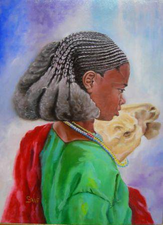 Na obrazie widoczna jest postać z profilu, mająca na sobie intensywnie zieloną szatę oraz czerwoną pelerynę. Jej włosy są misternie splecione w drobne warkoczyki, co nadaje jej wygląd harmonii i precyzji. Tło miesza delikatne pastelowe odcienie niebieskiego i fioletu, tworząc spokojną aurę. Obok postaci widać głowę zwierzęcia, która wprowadza ciepło i naturalność. To malowidło emanuje spokojem, a jednocześnie jest pełne głębokiego spojrzenia na kulturę i życie codzienne. Artysta zastosował technikę olejną, co dodaje obrazowi głębi i tekstury. Całość przywodzi na myśl statement o pięknie i różnorodności życia. Widać dbałość o szczegóły i grę światła na powierzchni płaszcza i włosów. Może to wywoływać u odbiorcy uczucie fascynacji i nostalgii za nieznanym światem. Naprawdę, to jest takie pretty! Obraz ten daje do myślenia o wartościach kulturowych i tradycji, równocześnie oddając hołd codzienności. Fascynujący.