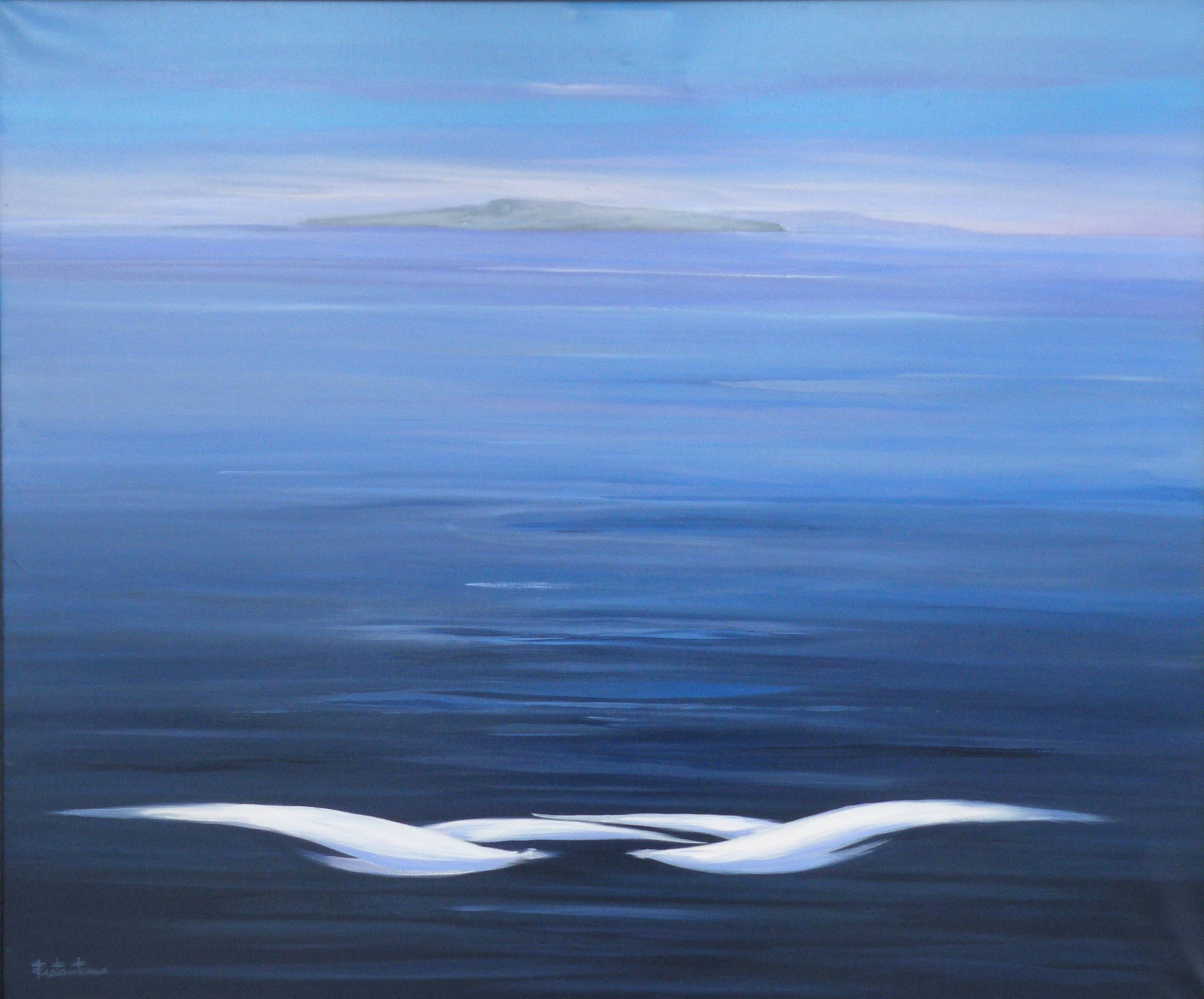 Na obrazie dominuje błękit nieba i morza, które stapiają się w jedną, niemal magiczną całość. Pastelowe odcienie błękitu i szarości tworzą uspokajającą kompozycję. Na linii horyzontu widać delikatny zarys odległej wyspy, dodającej obrazowi głębi. Całość ma minimalistyczny charakter, co podkreśla nowoczesny styl artystyczny. Artysta zastosował tu technikę zacierania konturów, co nadaje obrazowi delikatność i miękkość. Patrząc na ten obraz czuć spokój, jakby czas zatrzymał się na chwilę. „Look, płyniemy!” — takie uczucie może towarzyszyć widzowi, jakby obraz zapraszał do zanurzenia się w tej spokojnej przestrzeni. Dzieło emanuje atmosferą intymności i harmonii, a jednocześnie pozostawia pewną tajemnicę. Ciekawe, co kryje się na tej wyspie? Obraz może skojarzyć się z letnim popołudniem na plaży, kiedy słońce łagodnie muska wodę. To dzieło jest jak zaproszenie do marzeń o bezkresnym spokoju.