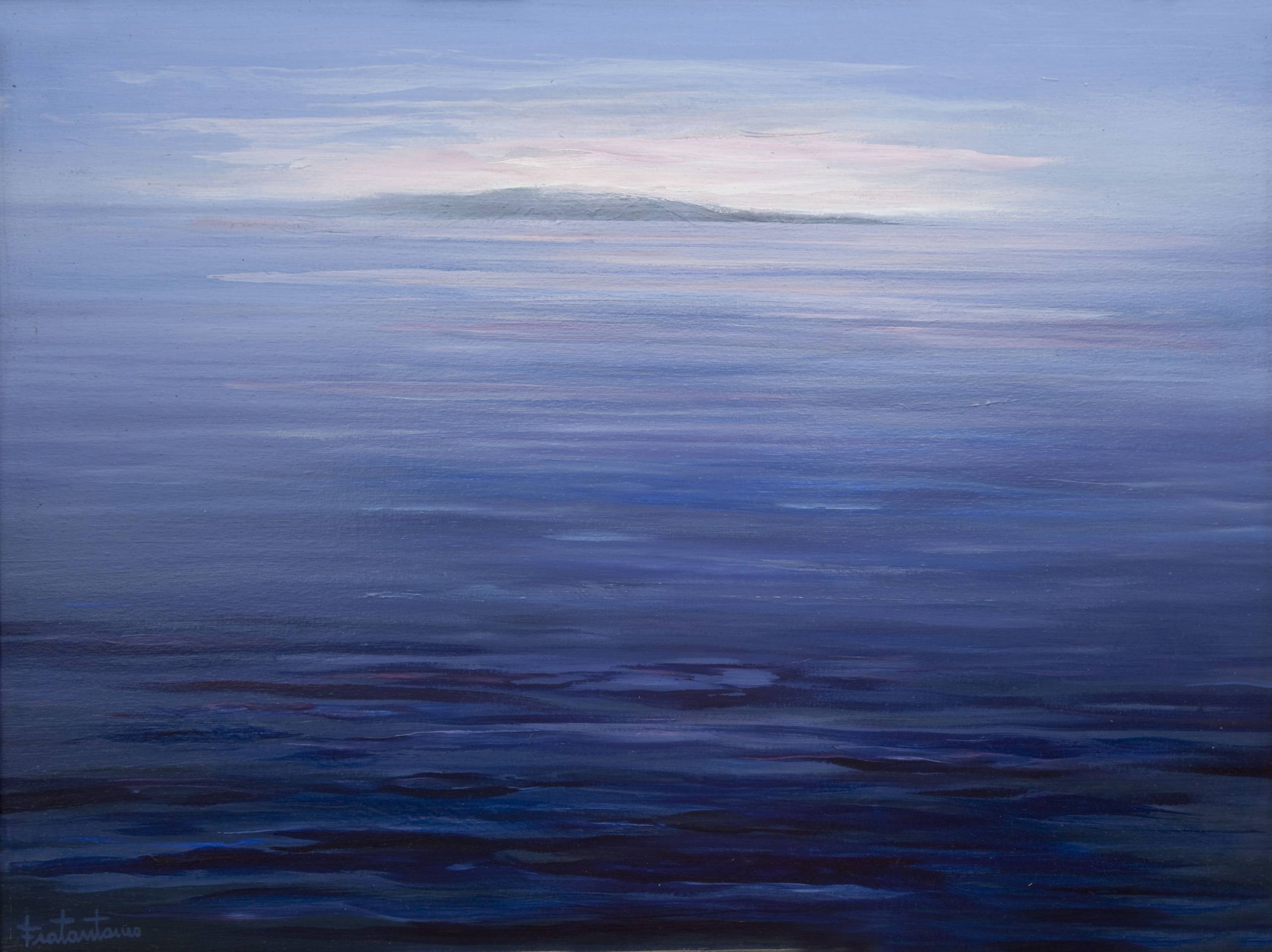 Na obrazie dostrzegamy spokojne morze, które rozciąga się aż po horyzont, z delikatnymi różowymi i niebieskimi odcieniami, tworząc harmonijną tęczę kolorów. Dominują tu błękity i purpury, które łączą się w miękkie przejścia, jakby płynęły z jednego pociągnięcia pędzla. Kompozycja jest niezwykle prosta, co dodaje całości elegancji i spokoju. Krajobraz emanuje ciszą, jakby czas się zatrzymał. To magiczny moment tuż przed zachodem słońca. Artysta użył subtelnych, lecz wyrazistych pociągnięć pędzla, tworząc efekt delikatnych fal na wodzie. Ta prostota w technice przypomina trochę dreamlike wizję. Obraz może wywołać refleksję nad nieskończonością, ale też prostą radością bycia tu i teraz. Czuję, że to miejsce stało się moim spokojnym przystanią. Jeden krok na tej niebieskiej wodzie i jesteśmy daleko od codziennego zgiełku. A fale mówią "chodź, pobaw się z nami". Taki spokój, aż chce się wziąć głęboki oddech i zapomnieć o całym świecie.