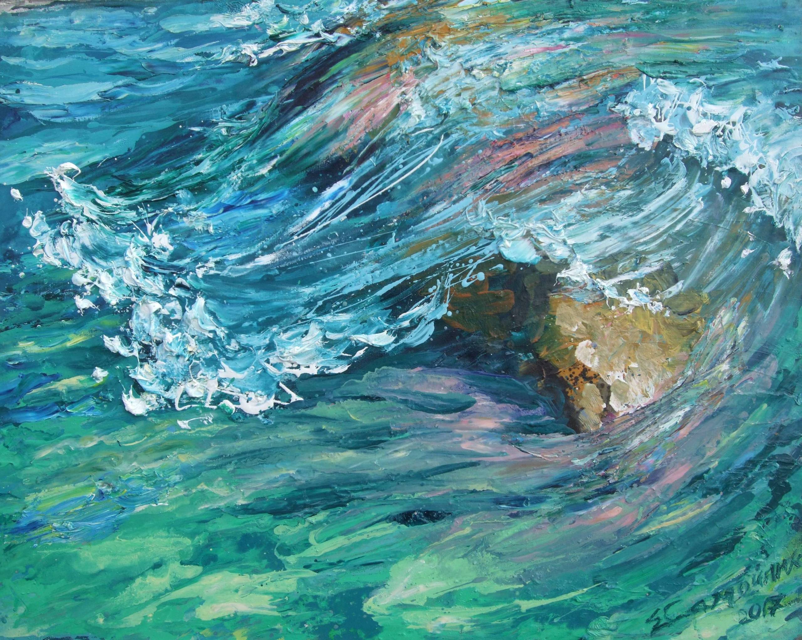 Na obrazie widzimy dynamiczne fale, które swobodnie igrają ze sobą. Kolory przypominają feerię turkusów, błękitów i szmaragdów, z odważnymi pociągnięciami bieli, które formują imponujące grzywy piany. Wodna kompozycja jest pełna ruchu, niemal czujemy, jak fale delikatnie chłodzą nam twarz. Obraz emanuje energią i życiem, jakby nagle zatrzymać się w burzliwym momencie oceanu. Styl artysty jest ekspresyjny, pociągnięcia pędzla są spontaniczne, co dodaje obrazu wrażenia niespożyćtej siły natury. Technicznie wydaje się, że używa impastu, tworząc fakturę, która dosłownie wyskakuje z płótna. "Wow, te fale są jak giganty!" - powiedziałoby dziecko, patrząc z zachwytem. Widz, zapatrzony w tę wartką scenę, może odczuwać mieszankę niepokoju i zachwytu. Obraz przyciąga uwagę, nie pozwala się oderwać, oddając wrażenie bezkresności i potęgi morza. Emocje wirują, tworząc "storm" w sercu. To dzieło wywołuje nostalgię za dniami spędzonymi na brzegu, kiedy czas zdaje się zatrzymać, a wiatr niesie zapach przygody.