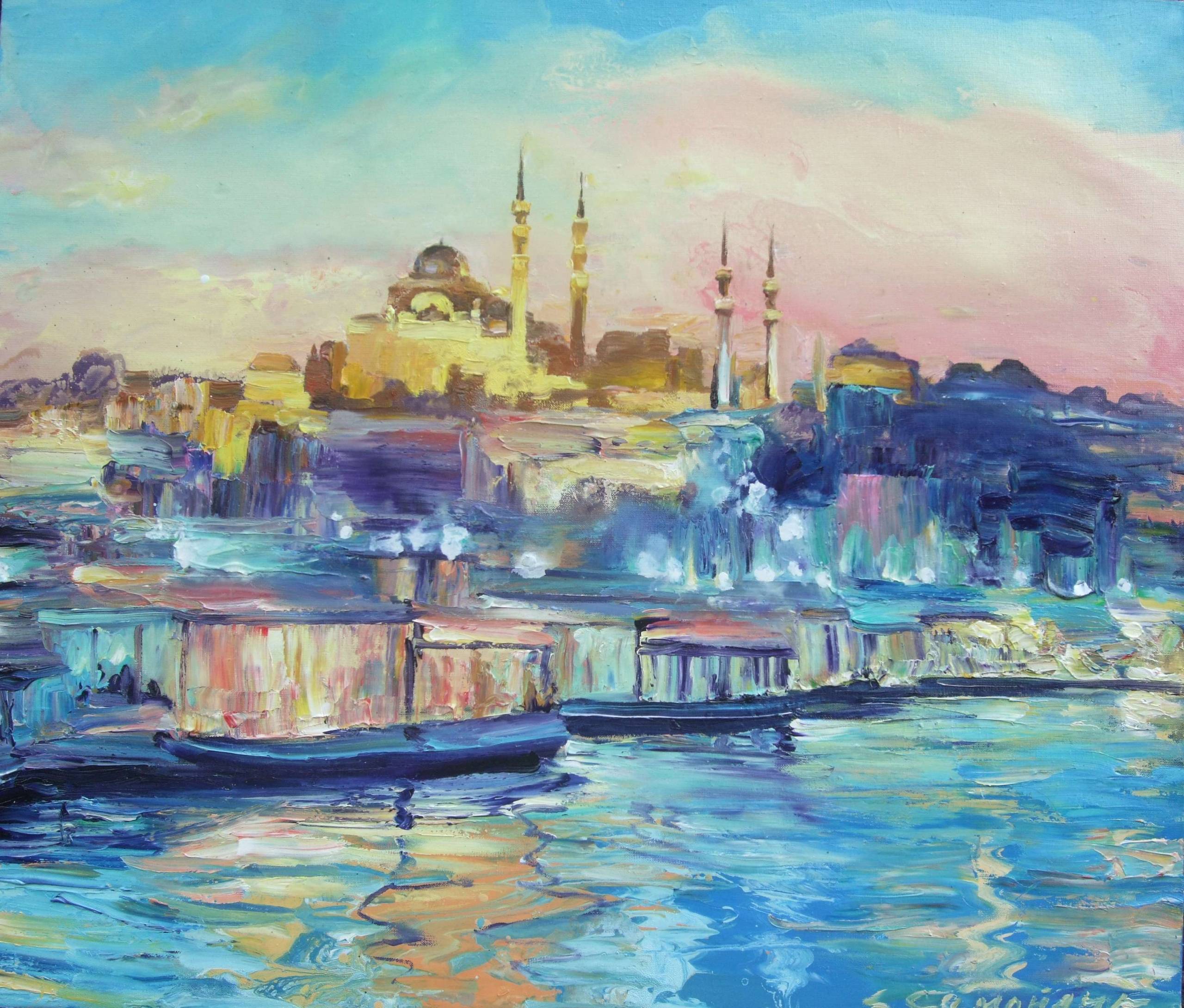 Obraz przedstawia pejzaż miasta skąpanego w zachodzącym słońcu, gdzie niebo miesza się z wodą w feerii pastelowych kolorów. Na horyzoncie wyłania się znany zarys meczetu z dwoma minaretami, które dumnie prężą się ku górze. Barwy przechodzą tu w harmoniczny chaos – błękity i róże splatają się niczym taniec na płótnie. Atmosfera jest jak wspomnienie z wakacji, które zostało utrwalone w kadrze. Stylistyka impresjonistyczna pełna jest dynamicznych ruchów i śmiałych pociągnięć pędzla. Ten obraz wygląda, jakby artysta malował z sercem, a nie tylko ręką. Kiedy patrzę na niego, czuję się jakbym był częścią tego miejsca. Woda w kanale, odbijająca różnorodne kolory, sprawia wrażenie, jakby była magic mirrors. Wywołuje to we mnie spokój i tęsknotę za miejscem, które być może nigdy nie odwiedziłem, a jednak czuję się z nim związany. Dla dziecka to wygląda jak kolorowa bajka: „To jest tak jak marzenie, jakby świat był z cukierkiem zrobiony!” Taki obraz sprawia, że człowiek się zatrzymuje, przystanęli i myśli o prostych chwilach życia. Wciąga, zaskakuje, uspokaja. Coś jakby obietnica przystani w chaosie codzienności.