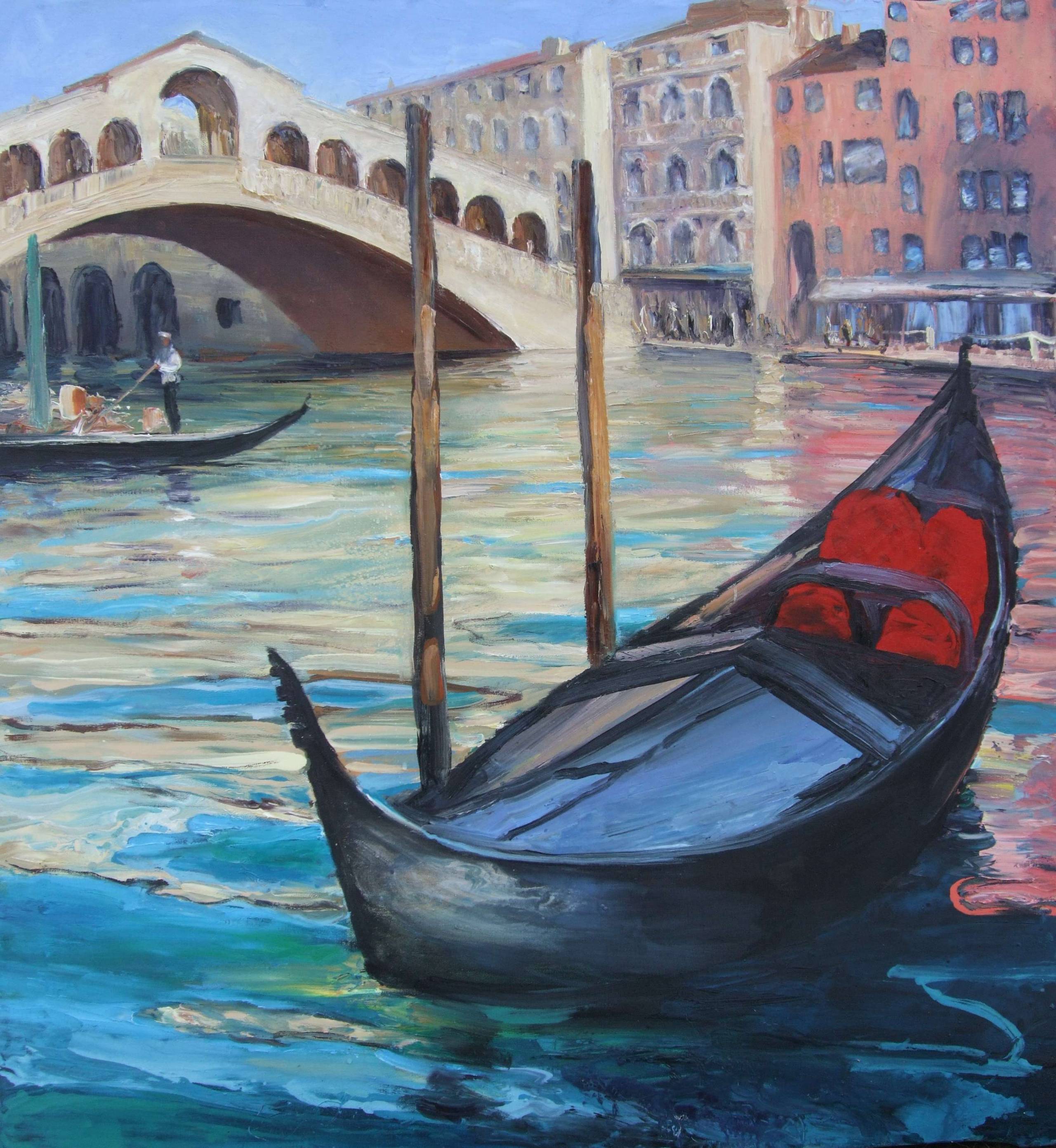 Na obrazie dominuje widok na spokojny kanał, na którym majestatycznie unosi się gondola z czerwonymi poduszkami, dodającymi nutkę ciepła i komfortu. Tło to malowniczy most, prawdopodobnie most Rialto, a wokół niego pastelowe fasady budynków, przy których widać subtelne odbicia. Woda błyszczy wieloma odcieniami błękitu i zieleni, tworząc iluzję ruchu i życia. Obraz zdaje się emanować atmosferą nostalgii i romantyzmu, przenosząc nas w inny świat, gdzie czas płynie wolniej. Artysta zastosował technikę impresjonistyczną, co widać po swobodnych, dynamicznych pociągnięciach pędzla i harmonii kolorów. Obserwując ten obraz, można poczuć spokój, a zarazem lekką tęsknotę za przygodą. "O, ta woda wygląda jak kraina czarów!", mogłoby powiedzieć dziecko. Dla mnie to swoisty portal do krainy marzeń, "like a dream". Kolory i światełka wiążą ze sobą fragmenty pamięci, jednocześnie zachęcając do refleksji. Niesie on ze sobą obietnicę chwili w oderwaniu od codzienności, gdzie wszystko staje się prostsze.