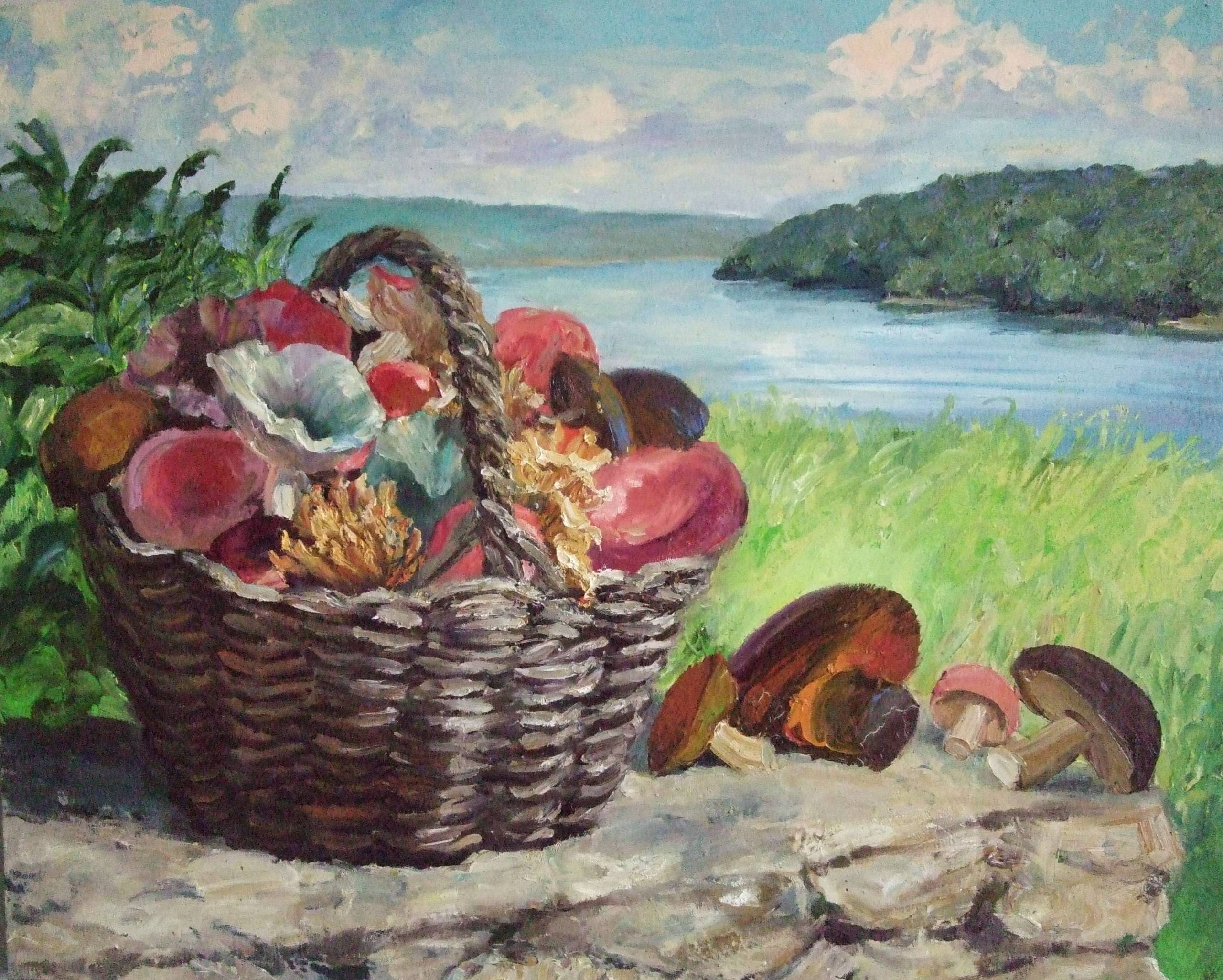 Kosz pełen grzybów, jak skarb ukryty na leśnej polanie. Ciemne, wiklinowe plecionki kontrastują z żywymi kolorami kapeluszy: czerwienie, brązy i zielenie przeplatają się niczym w bajce. Tło, delikatnie zatarte, ukazuje spokojny pejzaż z jeziorem, nad którym unoszą się puszyste chmurki. Niebo ma odcień błękitu i różu, które przechodzą płynnie jeden w drugi. Atmosfera obrazu jest pełna spokoju i harmonii z naturą, jak letni poranek tuż po deszczu. Niemalże czujesz zapach mokrej ziemi i świeżych grzybów. Technika malarska, z wyrazistymi pociągnięciami pędzla, sugeruje ekspresyjny styl impresjonistyczny, który dodaje głębi tym prostym przedmiotom. Dla siedmiolatka to bajka o grzybach, które w koszu znalazły dom. Ale dla dorosłych to medytacja nad prostotą natury. Obraz ten wzbudza uczucie nostalgia, przypominając o dzieciństwie i beztroskich wyprawach do lasu. "Nature's bounty", można by rzec, uwieńczona na płótnie. Emocje rozlewają się jak fala ciepła w sercu. Czyż to nie piękne, jak sztuka potrafi przemawiać do każdego inaczej?
