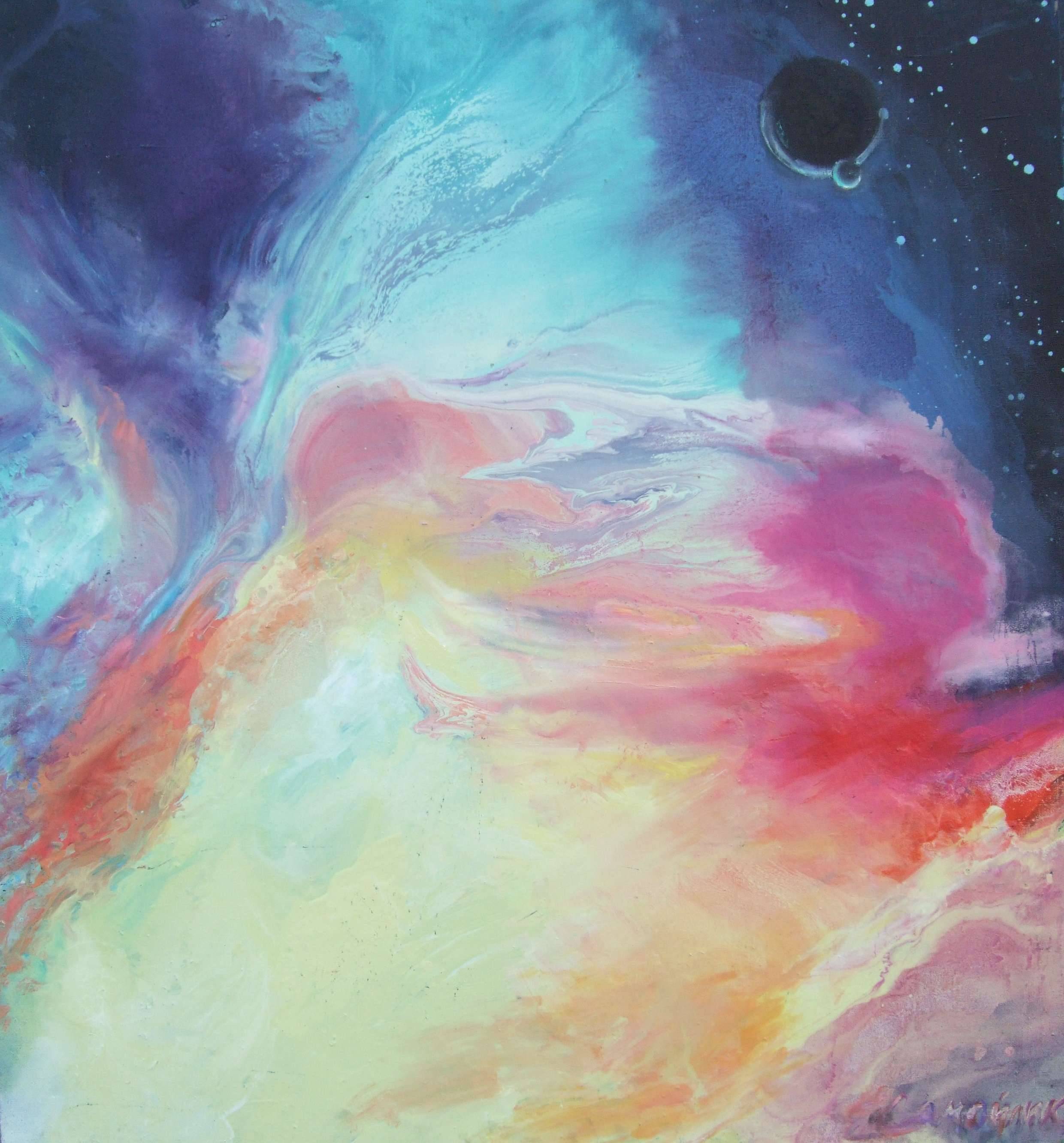 To malowidło to prawdziwa eksplozja barw i ruchu. Jasne, żywe kolory - błękity, róże, fiolety i odcienie złocistego pomarańczu - tworzą dynamiczną kompozycję, która zdaje się być w ciągłym ruchu. Kształty przypominające wirujące obłoki dodają obrazowi niezwykłej lekkości i płynności. Atmosfera jest nieziemska, trochę jakbyśmy byli gdzieś w kosmicznej galaktyce pełnej Stellar wonders, gdzie można poczuć się prawdziwie malutkim. Technika, jaka została tu użyta, przypomina impresjonizm z domieszką abstrakcji. Artysta z wprawą miesza barwy, przelewając je niczym farby na palecie, tworząc przy tym iluzję głębi i przestrzeni. To dzieło wywołuje uczucie zachwytu, ale też niepewności. Może jesteśmy w oku kosmicznego wichru? Albo to po prostu malarska impresja na temat narodzin gwiazdy? Dla siedmiolatka to pewnie coś jak magia. "Całe niebo się rozpłynęło!" Emocje biją na oślep i trudno nie poczuć lekkiej adrenaliny. To obraz, który zmusza do refleksji i sprawia, że dusza tańczy. Jest czymś jak sen na jawie, nieograniczony, pełen potencjału, zachęcający do puszczenia wodzy wyobraźni. Prawdziwa uczta dla oczu emocji.