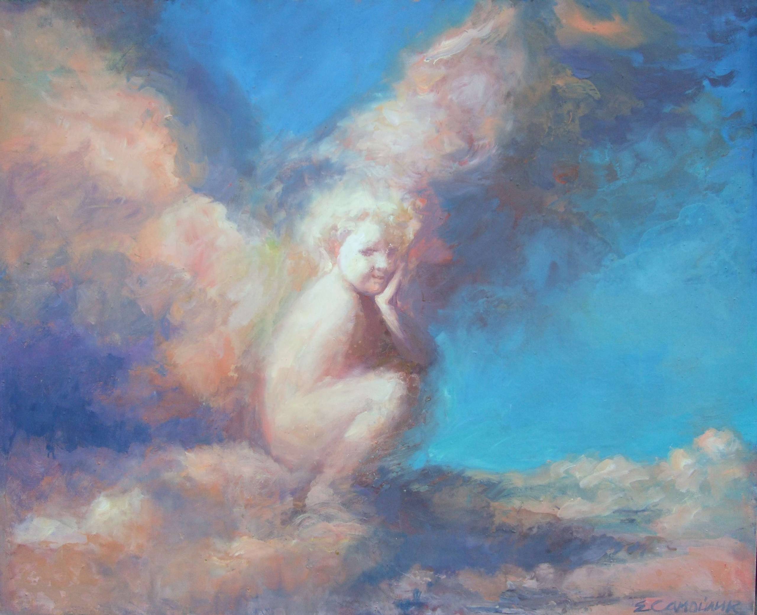 Na obrazie widać zjawiskową scenę pełną kolorów, które przypominają chmury skąpane w zachodzącym słońcu. Delikatne odcienie różu, fioletu i błękitu przenikają się wzajemnie, tworząc harmonię niemal magiczną. Na pierwszym planie, pośrodku pasteli, siedzi cherubinek o zadumanym wyrazie twarzy. Jego figura jest otoczona niezwykłymi formami chmur, jakby światło tańczyło wokół niego, podkreślając subtelność i łagodność sceny. Obraz emanuje spokojem i marzeniami, przywodząc na myśl chwile beztroski. Ten styl, bliski impresjonizmowi, z jego miękkimi pociągnięciami pędzla, sprawia, że dzieło wydaje się wręcz ulotne. Patrząc na ten obraz, można poczuć ciepło i ukojenie, jakby na chwilę zapomnieć o codziennych troskach. Dzieciak by powiedział: "To takie fajne niebo!". Jest w tym coś wręcz otherworldly, jakbyśmy mogli przenieść się do innej rzeczywistości. Dla mnie to przypomnienie, że w sztuce można odnaleźć spokój i refleksję. Obraz pozostawia u odbiorcy uczucie lekkości i zadumy nad pięknem świata.
