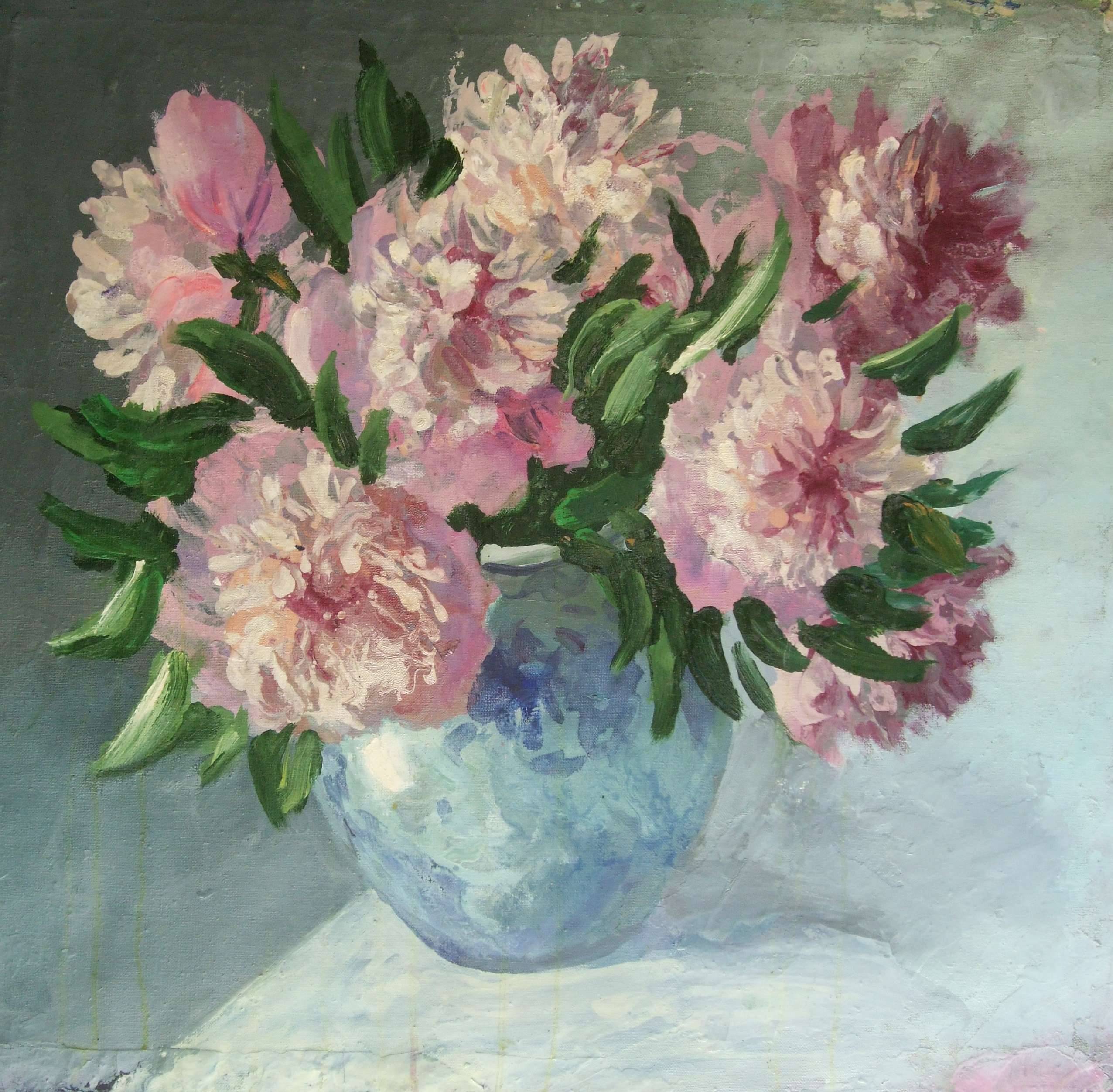 Na obrazie widzimy bukiet pełen rozkwitających piwonii w pastelowych odcieniach różu i bieli, umieszczony w eleganckim, niebieskim wazonie. Kwiaty są pełne życia, jakby tuż przed chwilą zostały zerwane z ogrodu. Ich delikatne płatki, napawają oczy ulotnym pięknem natury. Zarys wazonu jest lekko rozmyty, co nadaje całości pewnego mistycznego uroku. Atmosfera dzieła emanuje spokojem i ciepłem – jak letnie popołudnie spędzone w ogrodzie babci. Artystyczny styl to prawdopodobnie impresjonizm, co podkreśla dynamiczna gra światła i cienia oraz swobodne pociągnięcia pędzla. Obraz może wywoływać uczucia nostalgii i błogości. "Te kwiaty są jak marzenia!" – powiedziałoby dziecko, widząc ten obraz. Jest w nim coś magicznego, co pozwala na chwilę zatrzymać się i docenić piękno chwili. Subtelne połączenie kolorów oraz technika daje wrażenie, że piwonie tańczą w rytmie wiatru. Wow, the artist definitely captured the essence of fleeting beauty. Dzieło wydaje się mówić: "Zatrzymaj się na moment, zobacz to piękno". Za pracą stoi troska i umiejętność uchwycenia delikatności istnienia.