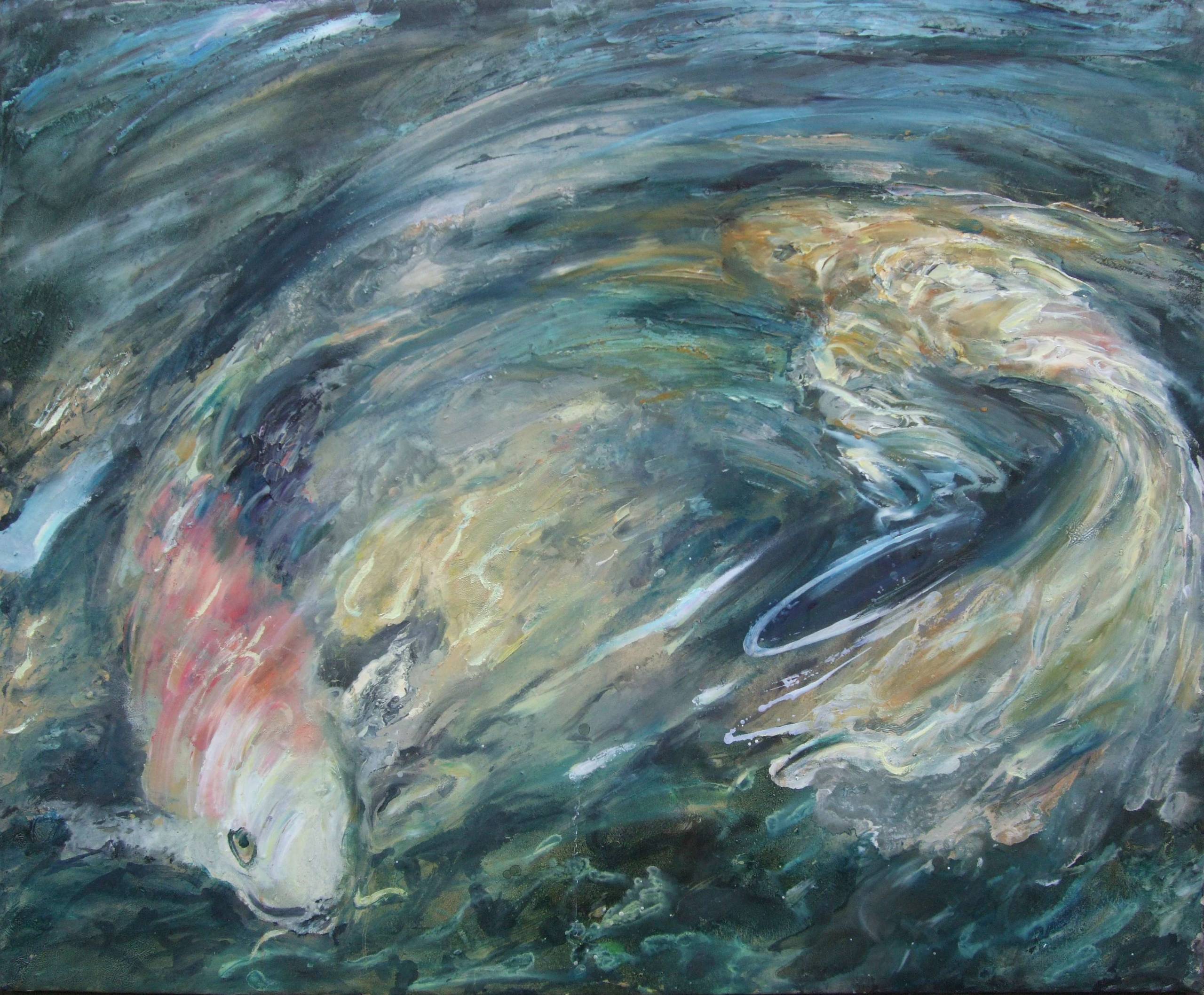 Obraz ukazuje dynamiczny ruch wody, pełen wirujących kształtów i płynnych linii. Dominuje tu paleta chłodnych niebiesko-zielonych tonacji, które przeplatane są cieplejszymi akcentami żółci i różu. Całość sprawia wrażenie jakby woda niemal tańczyła na powierzchni. Nastrój tego dzieła jest tajemniczy i pełen energii, czujemy jakbyśmy byli na chwilkę zanurzeni w nieskończonym wirze. Styl artystyczny przypomina abstrakcyjny ekspresjonizm. Artysta użył swobodnych pociągnięć pędzla, nadając obrazowi żywiołowości i intensywności. Technika warstwowego nakładania farby dodaje głębi, a różnorodność faktur sprawia, że powierzchnia obrazu wydaje się niemal "żywa". Gdy patrzę na ten obraz, czuję ekscytację i pewien niepokój. Jakby coś się miało wydarzyć. To jak marzenie, które balansuje na granicy snu i rzeczywistości. "Water dance" - tak bym to nazwał, bo jak inaczej opisać ten szalony wir kolorów i emocji. A rybka płynie szybko, bo chyba jest bardzo szczęśliwa. Ktoś może zobaczyć tu radość, ale jest też miejsce na melancholię. Może przypominać o chwilach ulotnych jak płynąca woda. Ten obraz żyje i oddycha własnym rytmem, który każdemu opowiedzieć może inną historię.