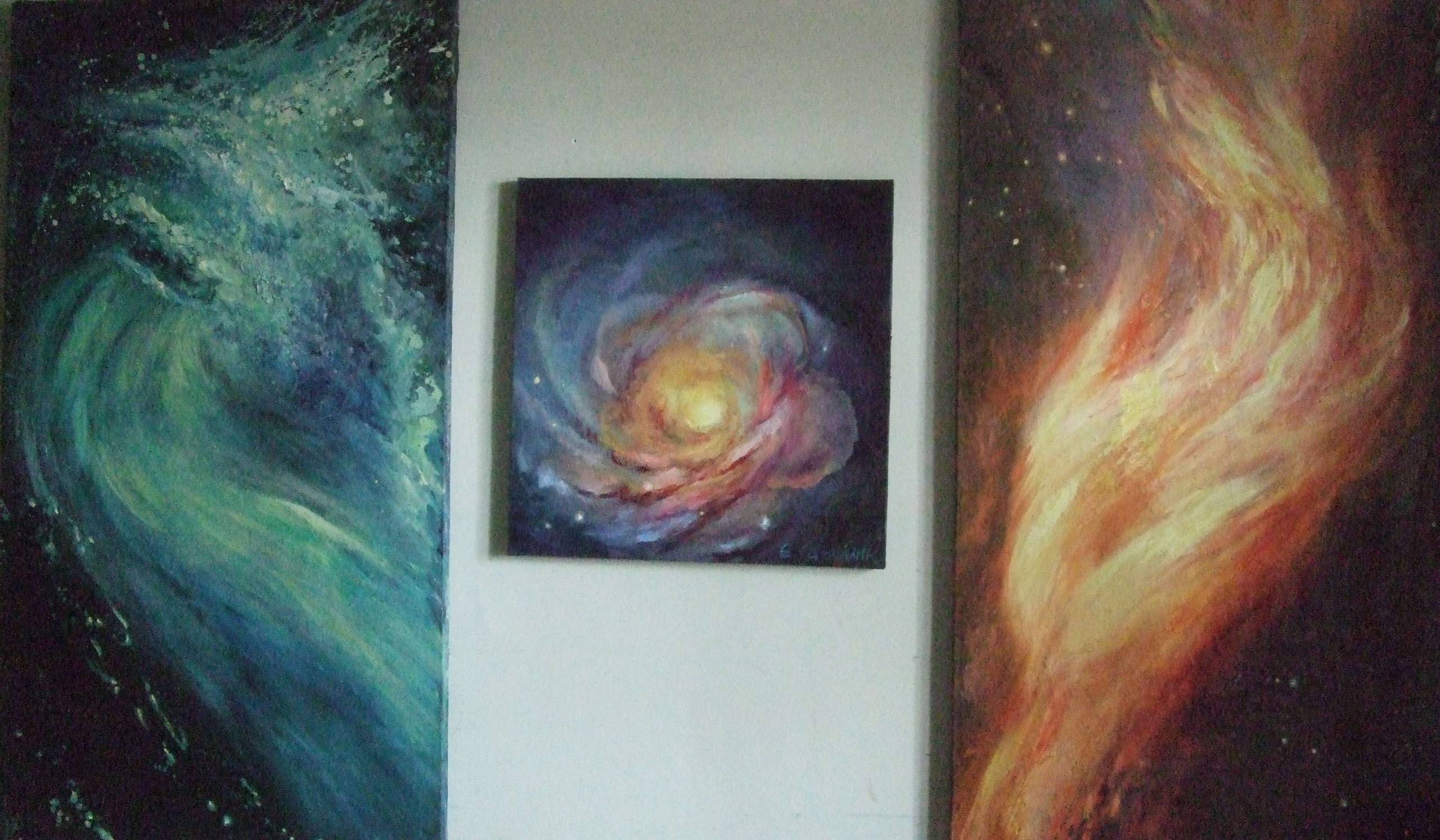 Триптих-состоит из трёх картин-две руки,одна огненная,другая из воды,посредине сотворённая галактика.