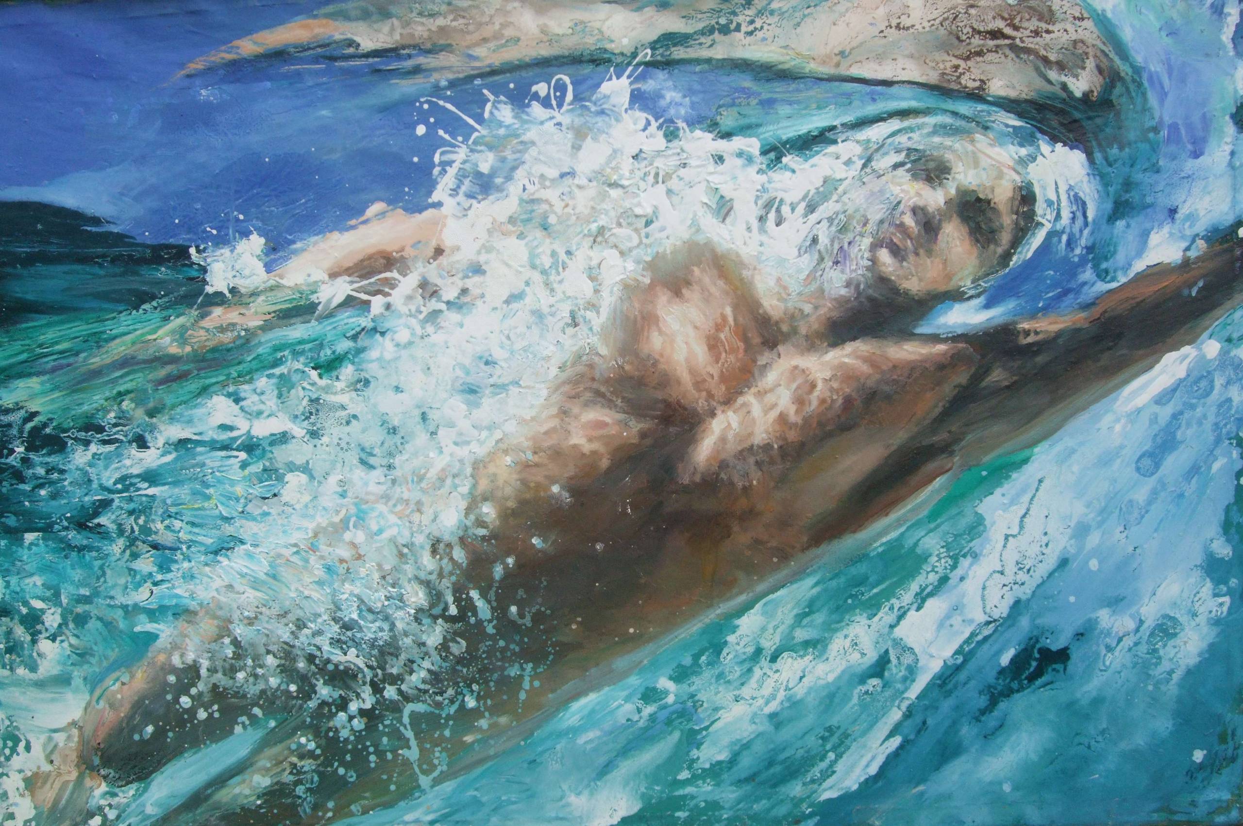 Na obrazie dominuje dynamiczny ruch wody, przedstawiony za pomocą burzliwych fal w odcieniach błękitu i turkusu. Postać pływaka jest artyzm ciałem pokrytym wodą, co sprawia, że wygląda na zanurzoną częściowo i jednocześnie unoszącą się na powierzchni. Artysta używa kontrastujących kolorów, precyzyjnie operując pędzlem, by uchwycić rozpryski wody i grę światła. Atmosfera kipiąca energią i swobodą, całkiem jak letni dzień na plaży, "pełna życia i pasji". Można poczuć przyjemne chłodzenie i orzeźwienie, jakbyśmy sami skakali do wody. Techniczne mistrzostwo malarza objawia się w sposobie oddania przepływu wody, za pomocą szybkich, pełnych ruchu pociągnięć. Zmieszanie abrstrakcji z realizmem przykuwa wzrok i wywołuje mocne emocje. Czujemy tę walkę z żywiołem i jednocześnie harmonię. Obraz ten może budzić w obserwatorze poczucie wolności i siły. Jak kiedyś powiedziało pewne dziecko, "taki fajny pływak, co jak rybka w morzu śmiga". To esencja pasji i siły, jaką każdy z nas chciałby w sobie odkryć. To imagery, które sprawia, że chce się do tej wody wskoczyć teraz, zaraz, no po prostu pływać.