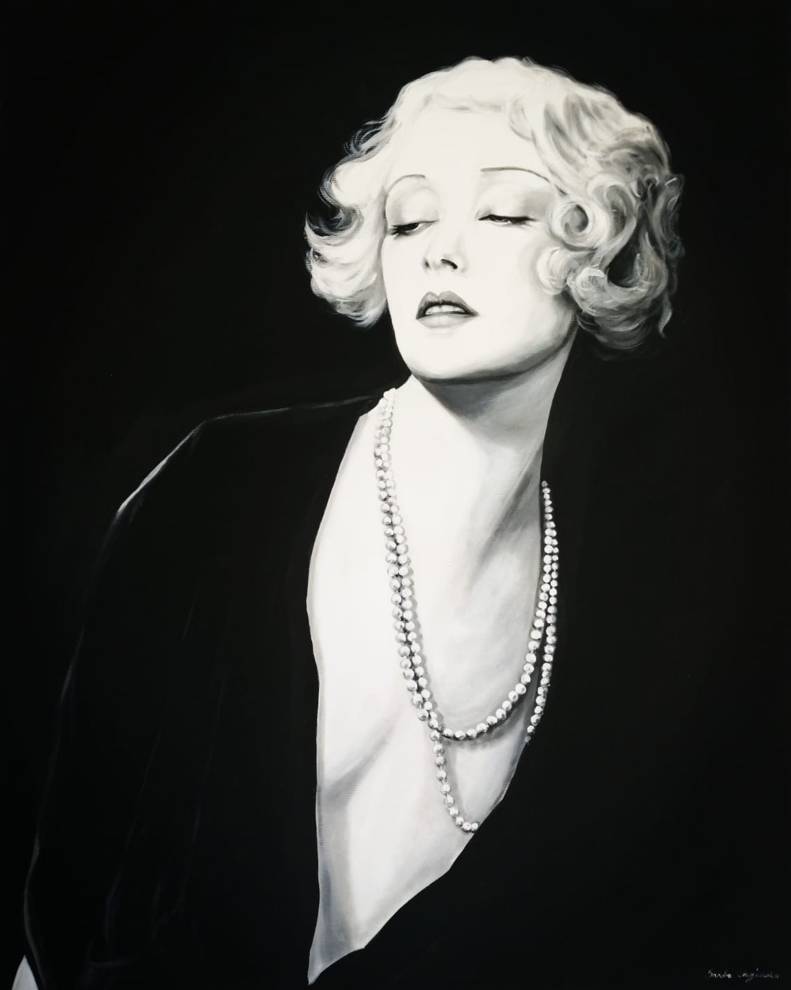 Na obrazie dominuje kontrast czerni i bieli, przypominający stare fotografie z czasów hollywoodzkiej klasyki. Kobieta o blond lokach spogląda w dół, a jej twarz pełna jest spokoju i tajemniczości. Białe perły na jej szyi dodają elegancji i stanowią centralny punkt kompozycji, prowadząc wzrok widza po płótnie. Atmosfera jest nieco nostalgiczna, jakbyśmy przenosili się w przeszłość, do lat dwudziestych. Styl artysty jest realistyczny, z delikatnymi pociągnięciami pędzla, sugerującymi perfekcję i detal. Obraz może wywoływać w odbiorcy poczucie tęsknoty za minionymi czasami glamour i blasku. Czuję, jakby ta postać miała swoje secret, które ukrywa przed światem. Technika chiaroscuro, użyta przez artystę, pięknie balansuje światło i cień, nadając scenie dramatyzmu. Dzieciak powiedziałby, że pani wygląda jak gwiazda z filmu. Jest tu też coś niezwykle eleganckiego, a przecież takie wibracje niełatwo uchwycić. Obraz pokazuje umiejętność uchwycenia emocji i stanów duszy poprzez prostotę i klasykę. Trochę jak when old meets new w niesamowitym duecie kolorów i form. To dzieło to prawdziwa perełka dla oka i duszy.