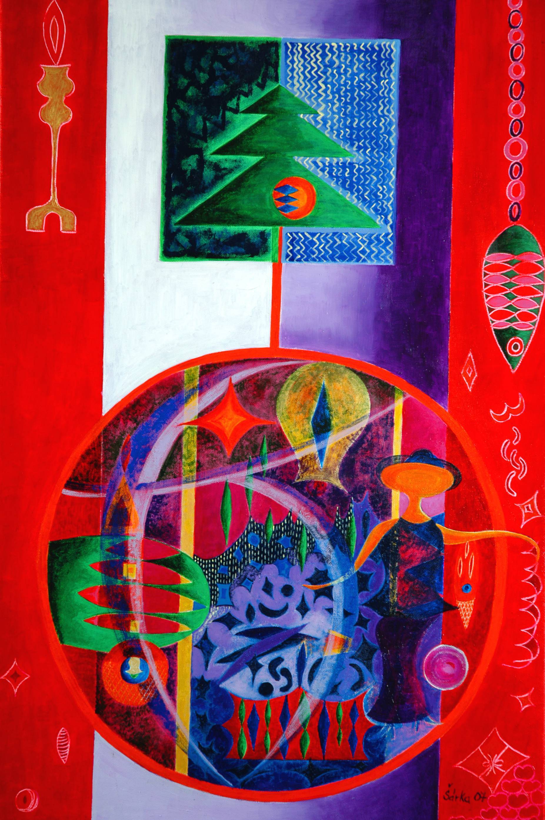 Obraz kipiący kolorami, które przyciągają oko niczym magnes. Intensywna czerwień i zieleń przeplatają się z fioletem, tworząc wizualny rollercoaster. Całość komponuje się w coś na kształt snu o dziwnej geometrii; trójkąty, koła i linie tworzą niezwykłą układankę. Jest jak świąteczna pocztówka z innego wymiaru. Atmosfera jest jednocześnie żywa i nieco tajemnicza. Styl przypomina mi artystyczne zabawy lat 60-tych, z dodatkiem modernistycznego twistu. Technika? Wygląda jak mix tradycyjnego malarstwa z cyfrowym vibe'em. Emocje, jakie budzi, to lekki niepokój zmieszany z fascynacją. To jak patrzenie na bańkę mydlaną, która ma zaraz pęknąć. Czasem można się poczuć jak Alicja w Krainie Czarów, z tą różnicą, że tu krainą jest surrealistyczny świat kolorów i form. Gdy siedmiolatek spojrzy na ten obraz, pewnie powie coś w stylu: "O, drzewko ma uśmiechniętą buzię!" I coś w tym jest. Bo choć widzimy abstrakcję, to w tej abstrakcji kryją się małe chwile radości i dziecięcej ciekawości. Dla mnie to taki visual feast, który jednocześnie cieszy i pobudza myśl.