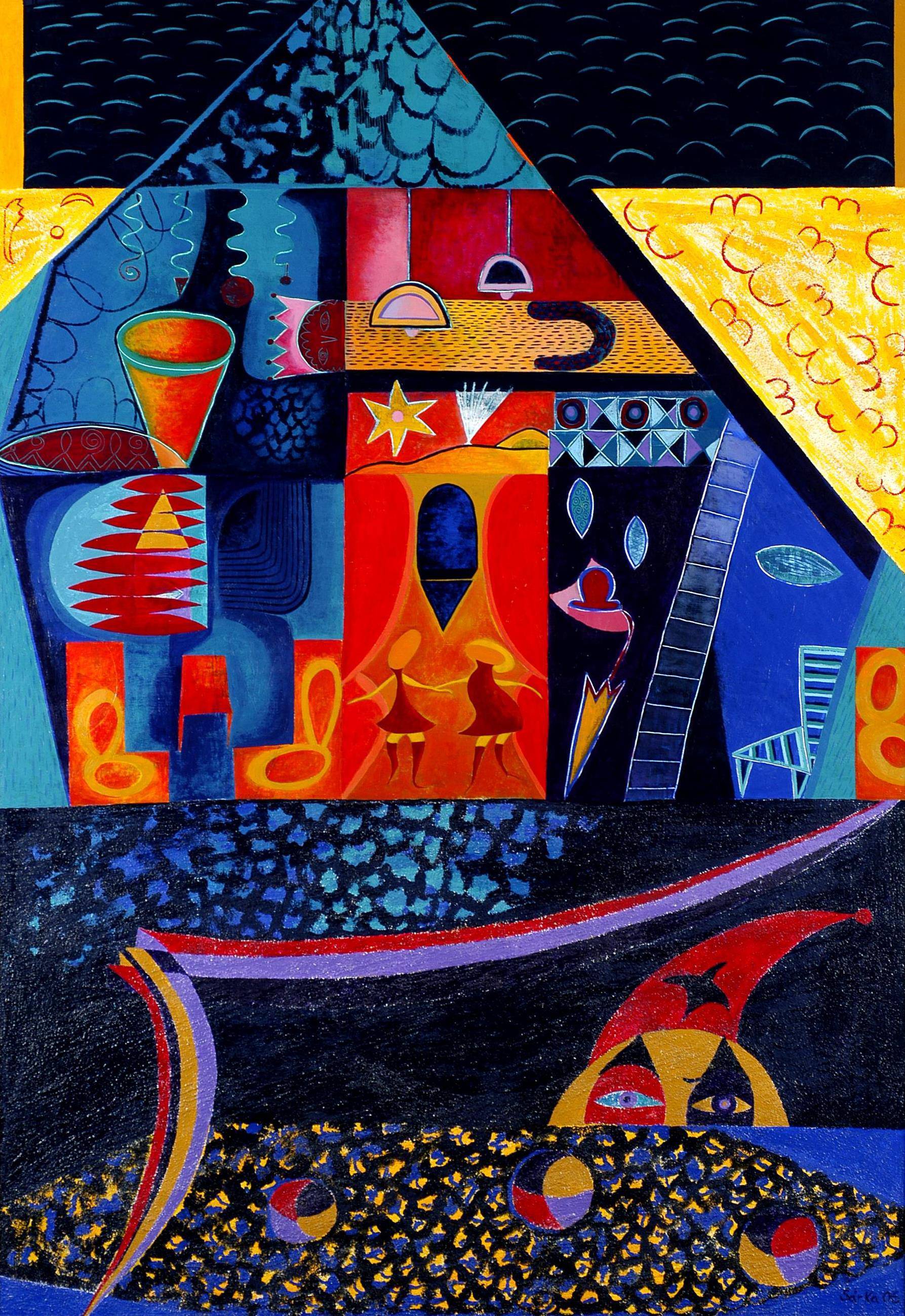 Ten obraz to prawdziwy kalejdoskop kolorów. Dominuje bogactwo błękitów i czerwieni, przeplatane ciepłymi żółciami i kontrastową czernią. Kształty są geometryczne, lecz nie do końca regularne. Jakby artysta celowo bawił się nieidealnością. W centralnej części widzimy coś na kształt sceny, z postaciami niemal uśmiechającymi się do widza. Powyżej jakby tajemnicze drzwi do innego świata. Atmosfera obrazu emanuje energią i radością. Taki trochę chaos na scenie, ale i tak wszystko działa. No, może z wyjątkiem tej dziwnej postaci w rogu. To dzieło przypomina dream, pełen niespodziewanych zwrotów akcji. Artysta zastosował techniki przypominające kubizm, lecz z wyraźnym wpływem abstrakcjonizmu. Linie precyzyjne, ale nie sztywne, detale bogate, lecz nie przytłaczające. Dla mnie obraz ten to wybuch kreatywności. Może wywołać u odbiorcy uczucie dziecinnej ciekawości. Jakbym znowu miał siedem lat i widział nową zabawkę. Obraz zmusza do zadania pytania: co on tam schował? Całość zdaje się mówić: weź oddech i zanurz się w tej magicznej chwili.