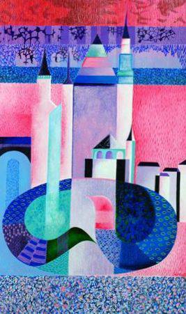 Obraz pełen kolorów i geometrii! Różne odcienie różu, niebieskiego i zieleni tworzą żywą mieszankę, która przyciąga wzrok. Na pierwszym planie dominują wyraziste wieże, które wznoszą się ku górze niczym magiczne zamki. Kształty są ostre, ale jednocześnie subtelne, co tworzy unikalną dynamikę. Kompozycja zachowuje równowagę dzięki symetrii i przemyślanemu rozmieszczeniu elementów. Atmosfera dzieła jest lekka i nieco dziecinna, pełna marzeń. Przypomina mi bajkę, którą kiedyś czytałem Styl artystyczny można określić jako abstrakcyjny, z nutką surrealizmu. Artysta zastosował technikę mieszania kolorów, co dodaje głębi i tajemnicy. Eksperymentując z krzywymi i prostymi liniami, stworzył efekt przestrzenności, jakby obraz był oknem do innego świata. Mogę poczuć nutkę nostalgii i dziecięcej ciekawości Obraz wywołuje we mnie mieszane uczucia. Patrząc na niego, można się uśmiechnąć i zatęsknić do czasów beztroski. Czasem te kolory sprawiają, że czuję się jak w "fairytale". Gdy patrzę na te wieże, myślę: "A może tu mieszka jakiś czarodziej?". Tak. To zdecydowanie świat z moich snów, taki, w którym wszystko jest możliwe. Ten obraz to jak portal do innych krain, pełnych przygód i tajemnic. Fascynujące, jak wiele emocji kryje się w takiej mieszance barw i kształtów.