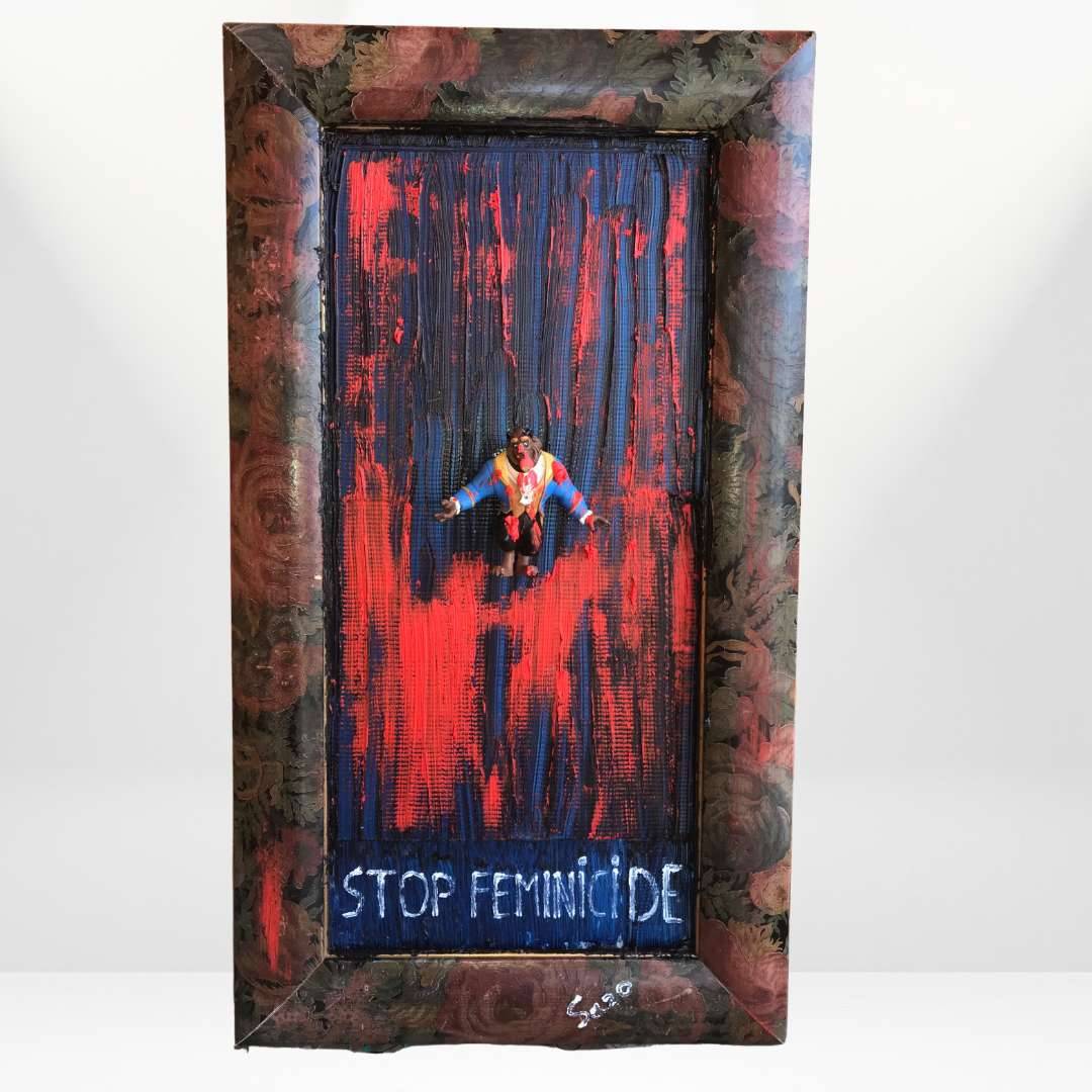 Obraz przedstawia intrygującą wizję pełną emocji i głębi. W centrum widnieje postać przymocowana do powierzchni złożonej z intensywnych, czerwonych i niebieskich pociągnięć farby. Te kolory, kontrastując ze sobą, tworzą dramatyczny efekt, niemalże krzycząc o uwagę widza. Tło wygląda jakby płonęło czerwienią, co może przywodzić na myśl konflikt czy napięcie. Jednocześnie forma postaci wydaje się uwięziona, co wywołuje uczucie bezsilności. Każdy dotyk pędzla jest tu celowy, może nawet trochę chaotyczny, ale zarazem mocno oddziałuje na emocje. Ramka z wzorem kwiatowym dodaje element nostalgii, kontrastując z mrocznym wnętrzem dzieła. W dolnej części obrazu wyraźnie widnieją słowa: "STOP FEMINICIDE". Przesłanie jest jasne: zwrócenie uwagi na problem przemocy wobec kobiet. Elementy te razem tworzą atmosferę pełną napięcia i determinacji. Dzieło może wywoływać w odbiorcy poczucie protestu i chęć działania. Użyta przez artystę technika mieszająca barwy i formy przypomina o złożoności i chaosie otaczającego świata. Wow, ale to mocny przekaz! Wpatrując się w to wszystko, czuć, że sztuka ma moc – to prawdziwe "call to action".